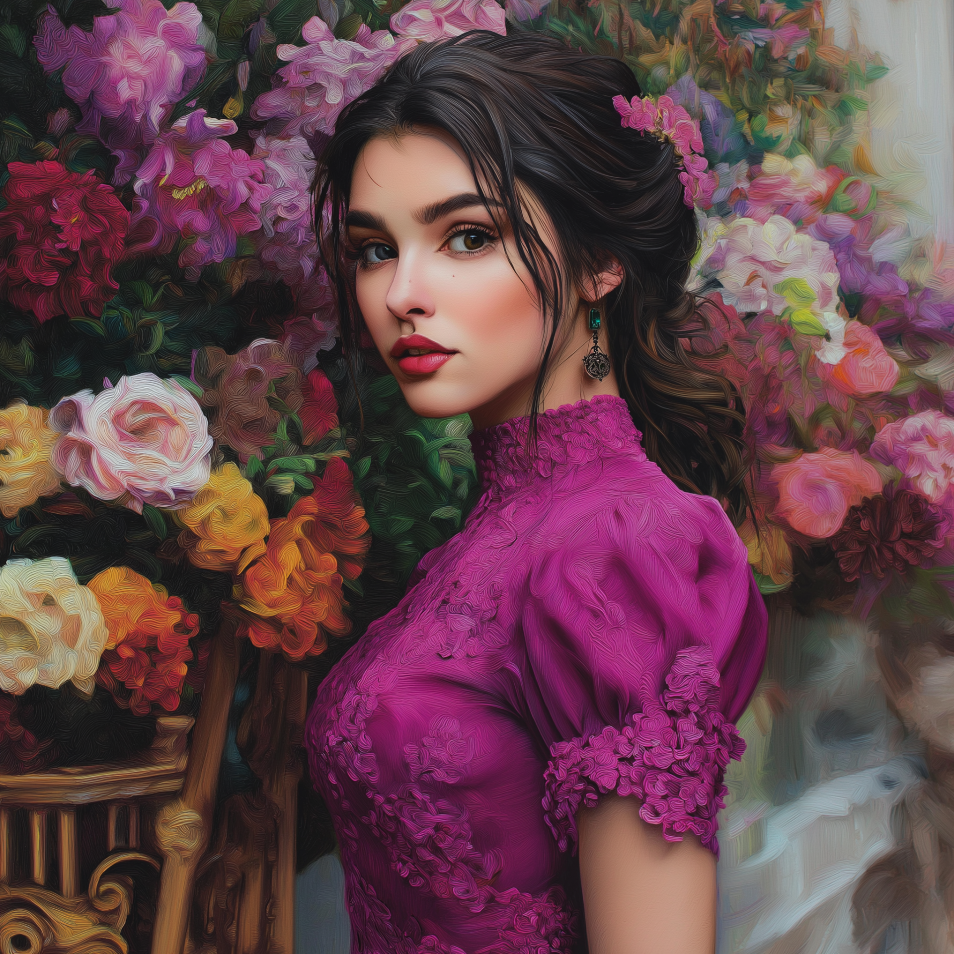 This image showcases a stunning 29-year-old model in an ultra-realistic style, dressed in a highly detailed magenta dress. With dark brown hair elegantly pinned up, she stands gracefully beside a vibrant flower cart, creating a beautiful composition.