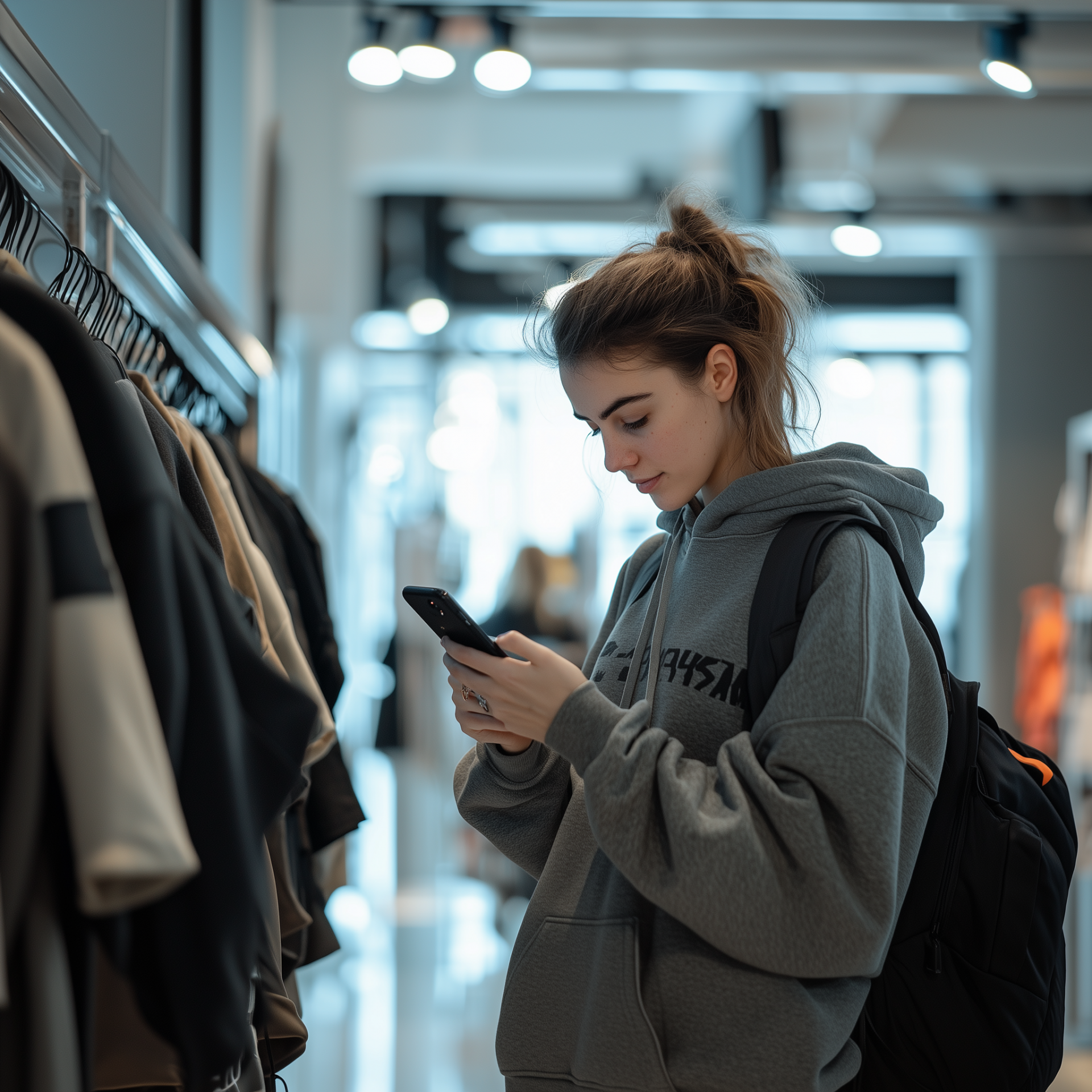 A street photograph captures a 32-year-old Italian lady immersed in shopping. She is stylishly dressed in a dark grey fleece sweatshirt, browsing through clothing racks while holding her phone.