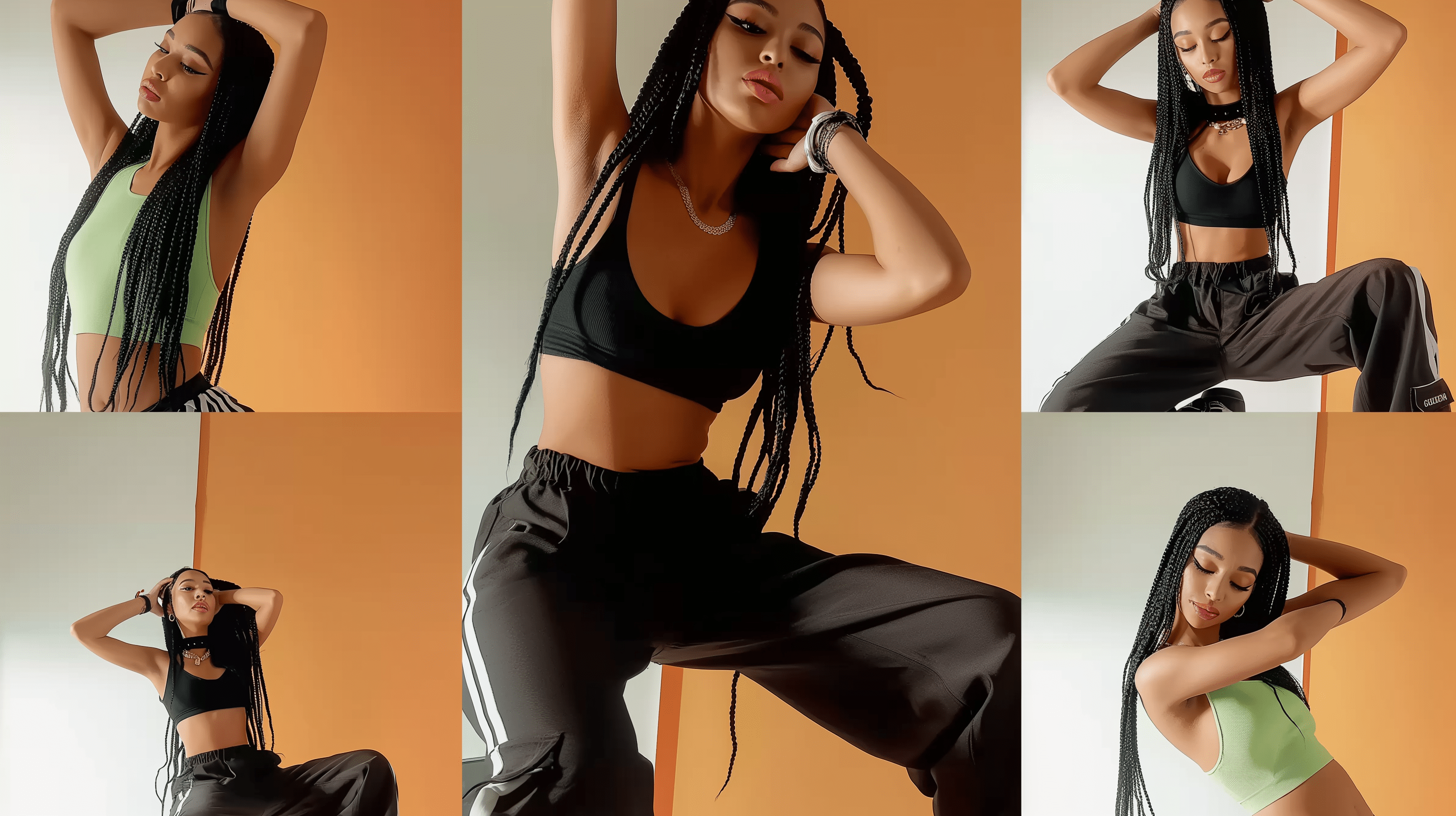 The image features a collage of a young woman from the UK, styled in Y2K clothing, showcasing various facial expressions from different angles. The photo-realistic quality captured in a studio highlights her full body shots and the distinct wrist watch she wears in each depiction.