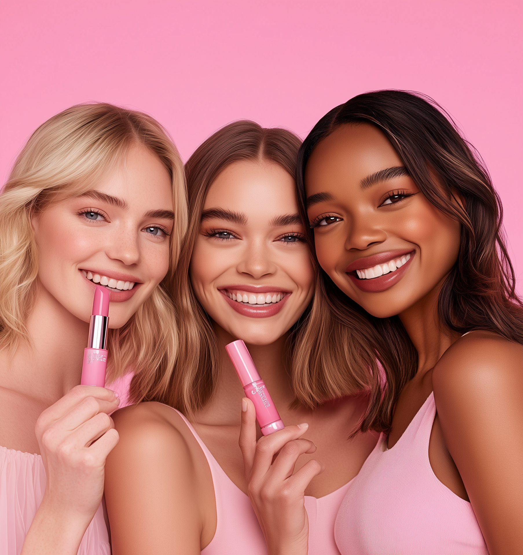The image features three diverse models who are joyfully smiling and showcasing a cosmetic product against a vibrant pink background. Their outfits are in soft pastel shades, creating a harmonious and uplifting vibe.