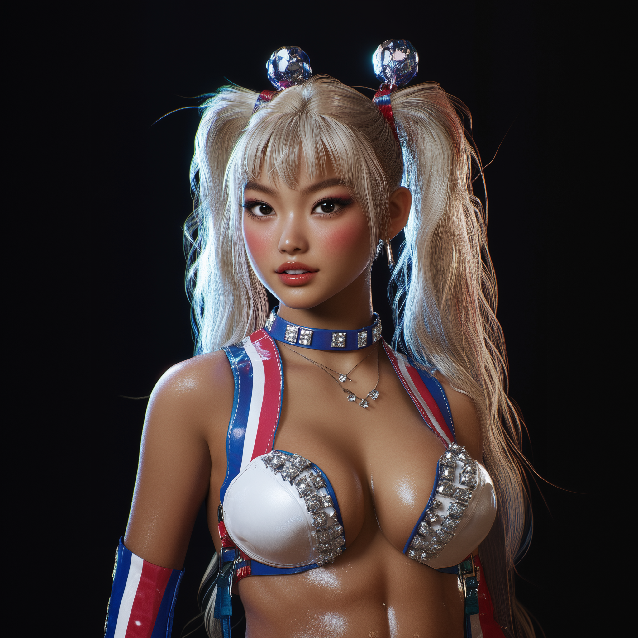 The image features a hyper-realistic portrait of a thick Asian woman with striking blonde hair that is adorned with red and blue stripes. She wears a dazzling white top studded with diamonds, set against a dramatic black background, creating a stunning contrast.