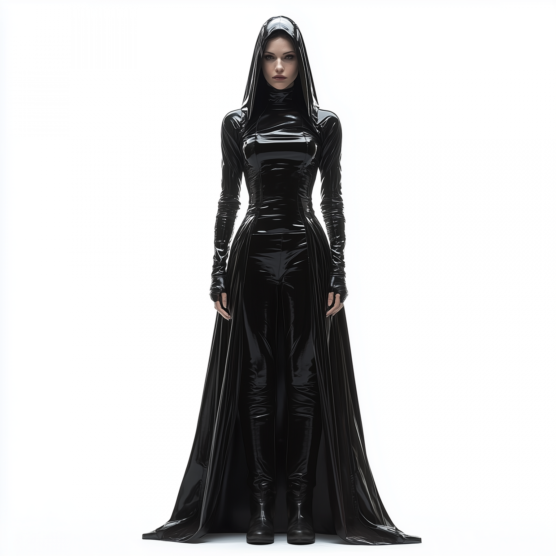 The image features a beautiful woman in her late 40s, elegantly dressed in a long black patent leather dress. She stands confidently against a white background, with her attire highlighting her sophisticated style.