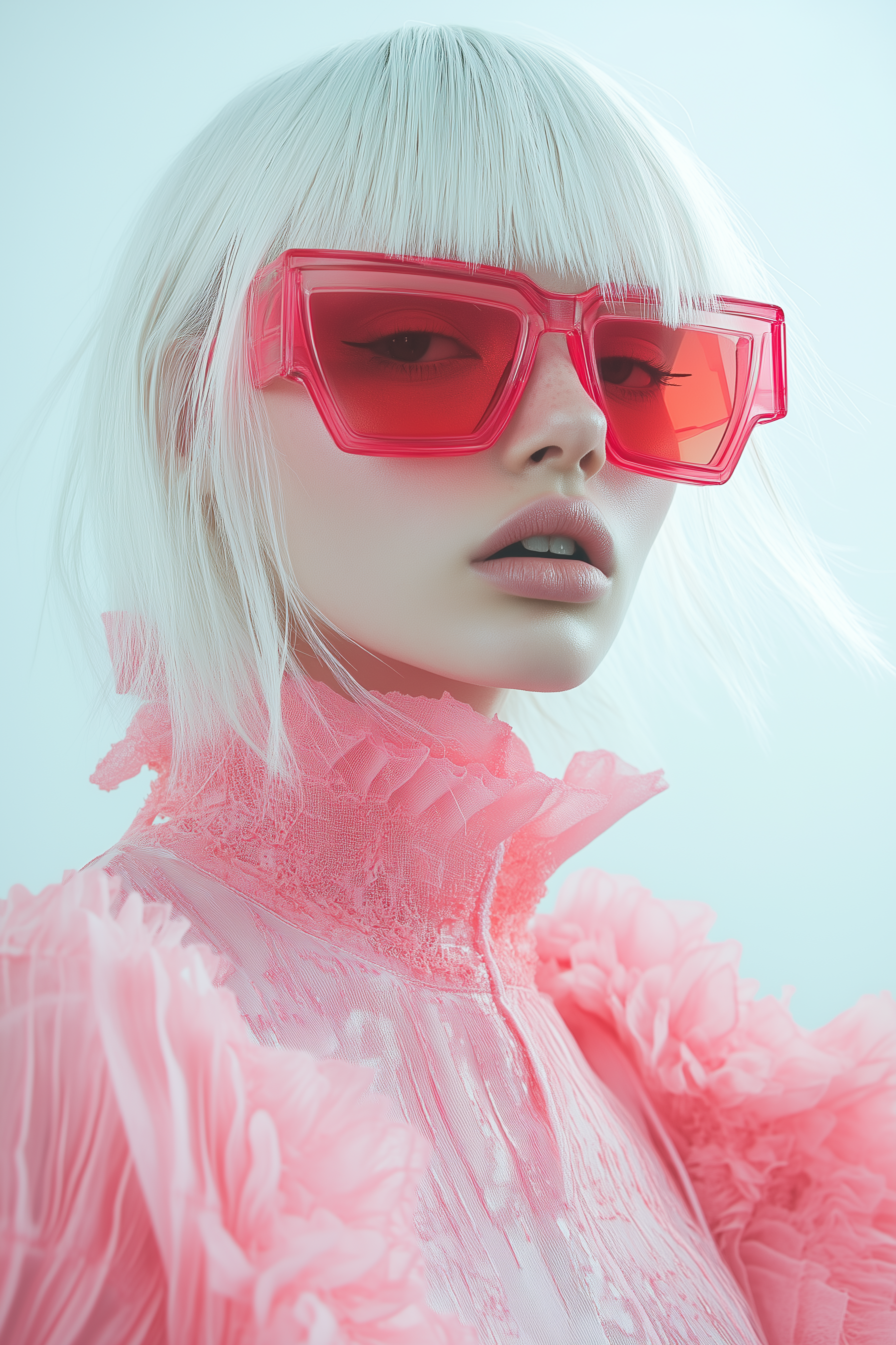 This close-up portrait captures the essence of fashion through striking facial expressions and intricate makeup. The play of soft light enhances the textures and details, creating a captivating visual appeal.