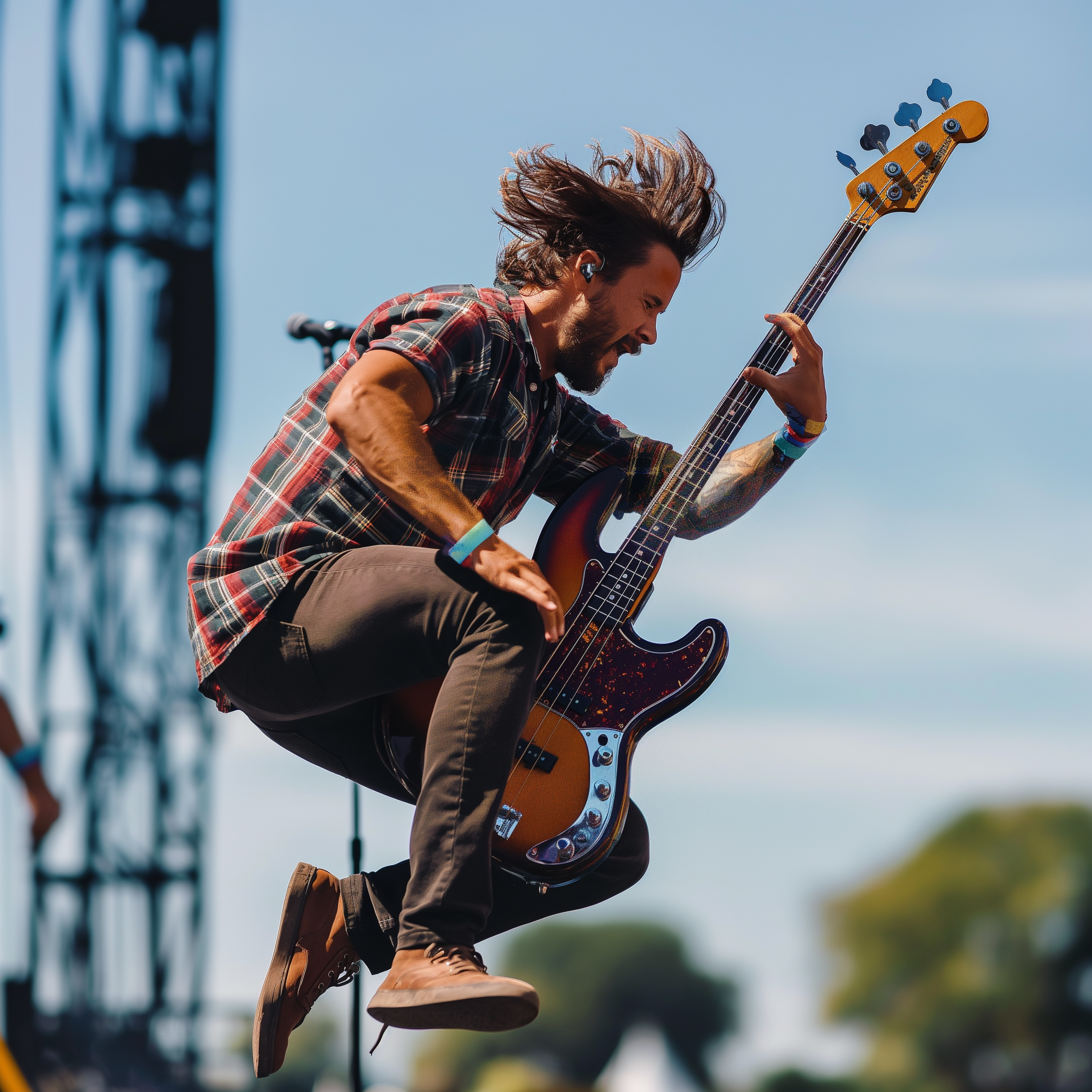 The image captures a male artist passionately playing a bass guitar while jumping in the air at an outdoor festival. The vibrant atmosphere of the festival is highlighted by colorful lights and a cheering crowd in the background.