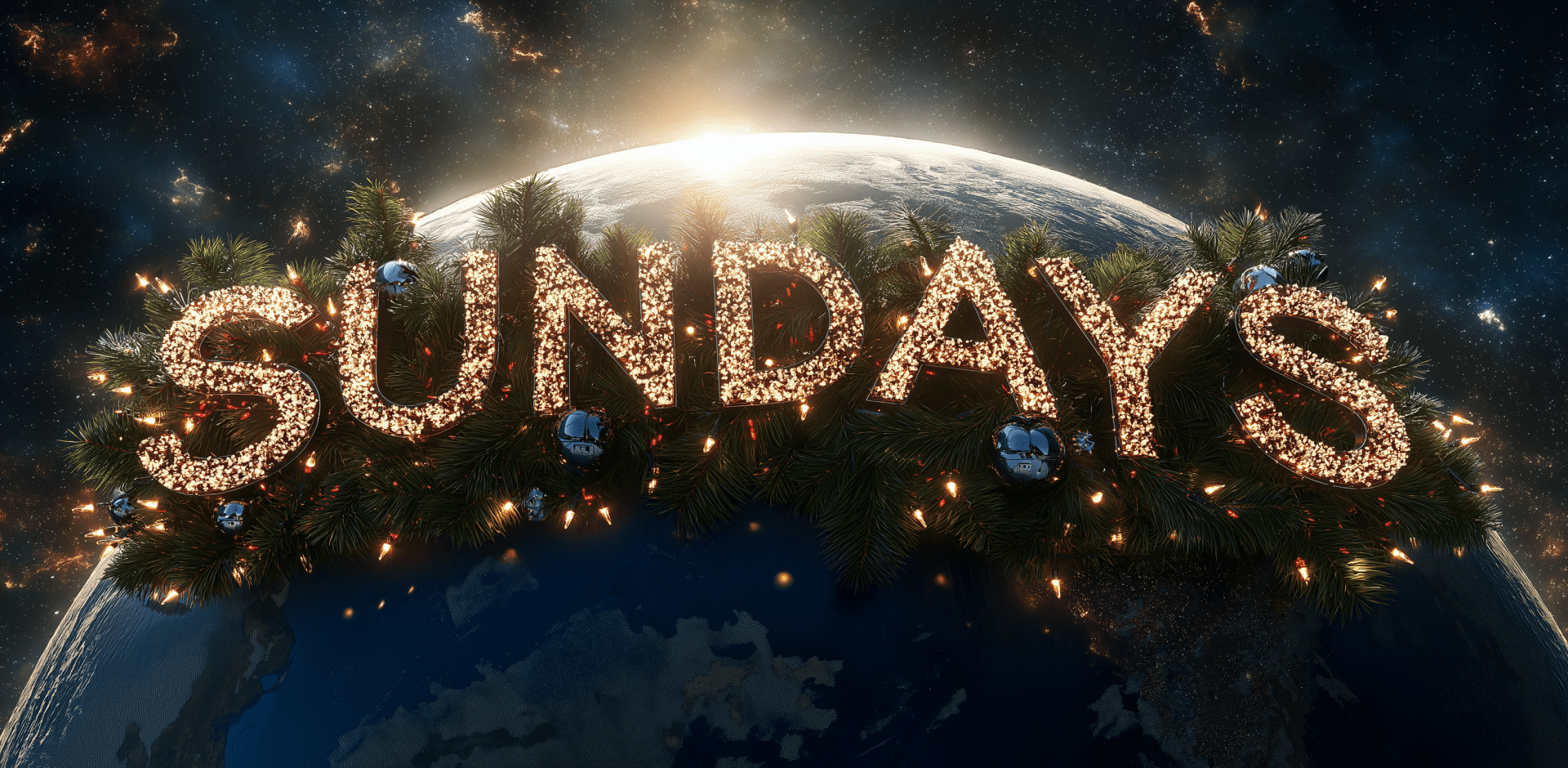 The image depicts the word 'SUNDAYS' crafted from Christmas tree branches and lights, set against a cosmic background. It conveys a festive spirit with a cinematic feel, emphasizing the beauty of space and celebration.