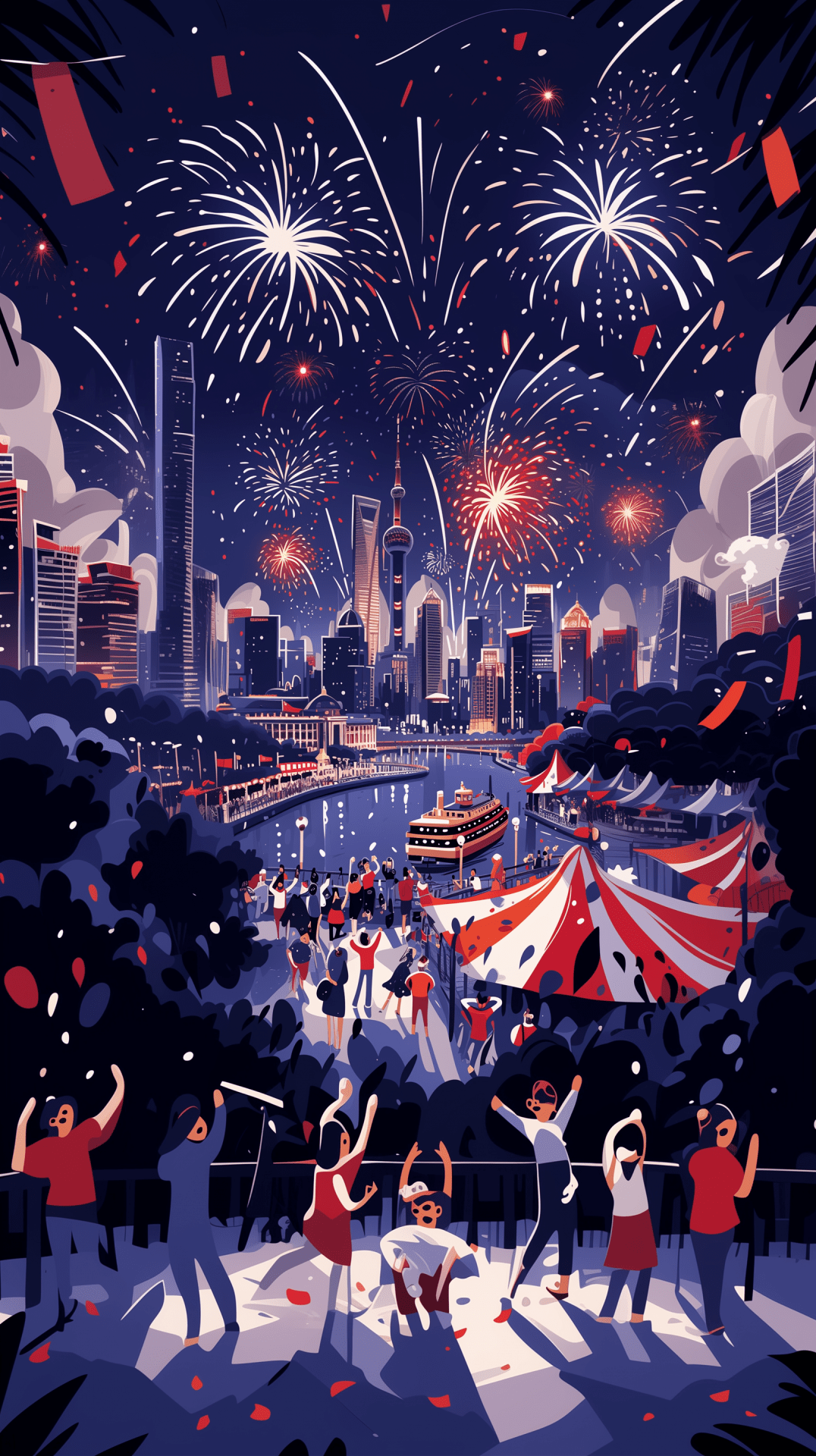 The illustration depicts a vibrant nighttime scene featuring the Shanghai skyline illuminated by colorful fireworks. People are seen dancing along the banks of the Huangpu River, creating a festive and joyful atmosphere for the New Year celebration.