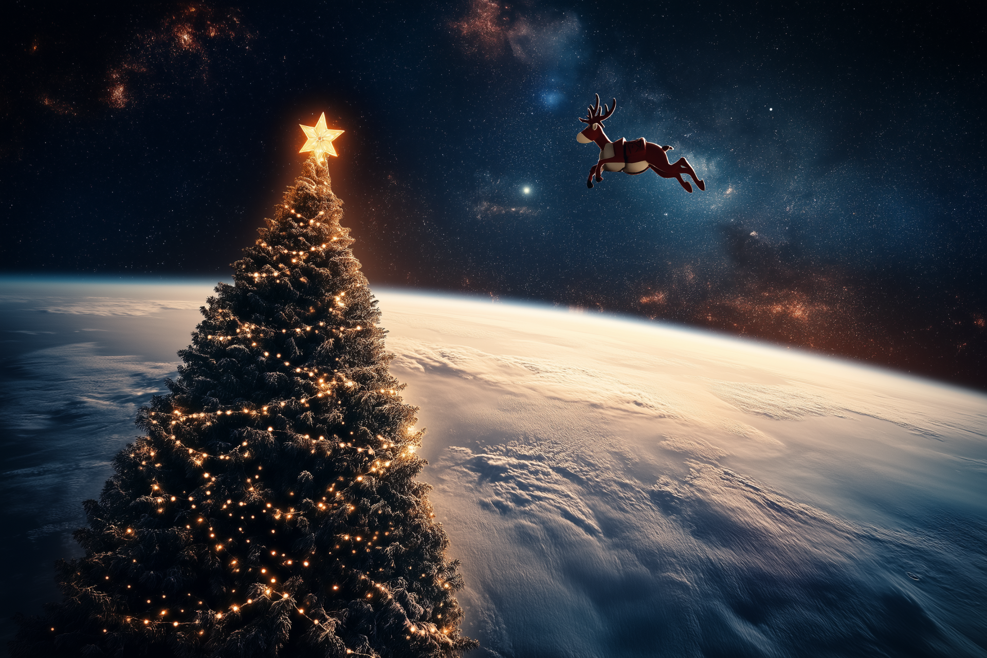 The illustration depicts a whimsical scene where giant Christmas trees ascend into the starry sky, hinting at their visibility from space. Alongside, a cheerful Rudolph with a glowing red nose is soaring through the cosmos, creating a magical festive vibe.