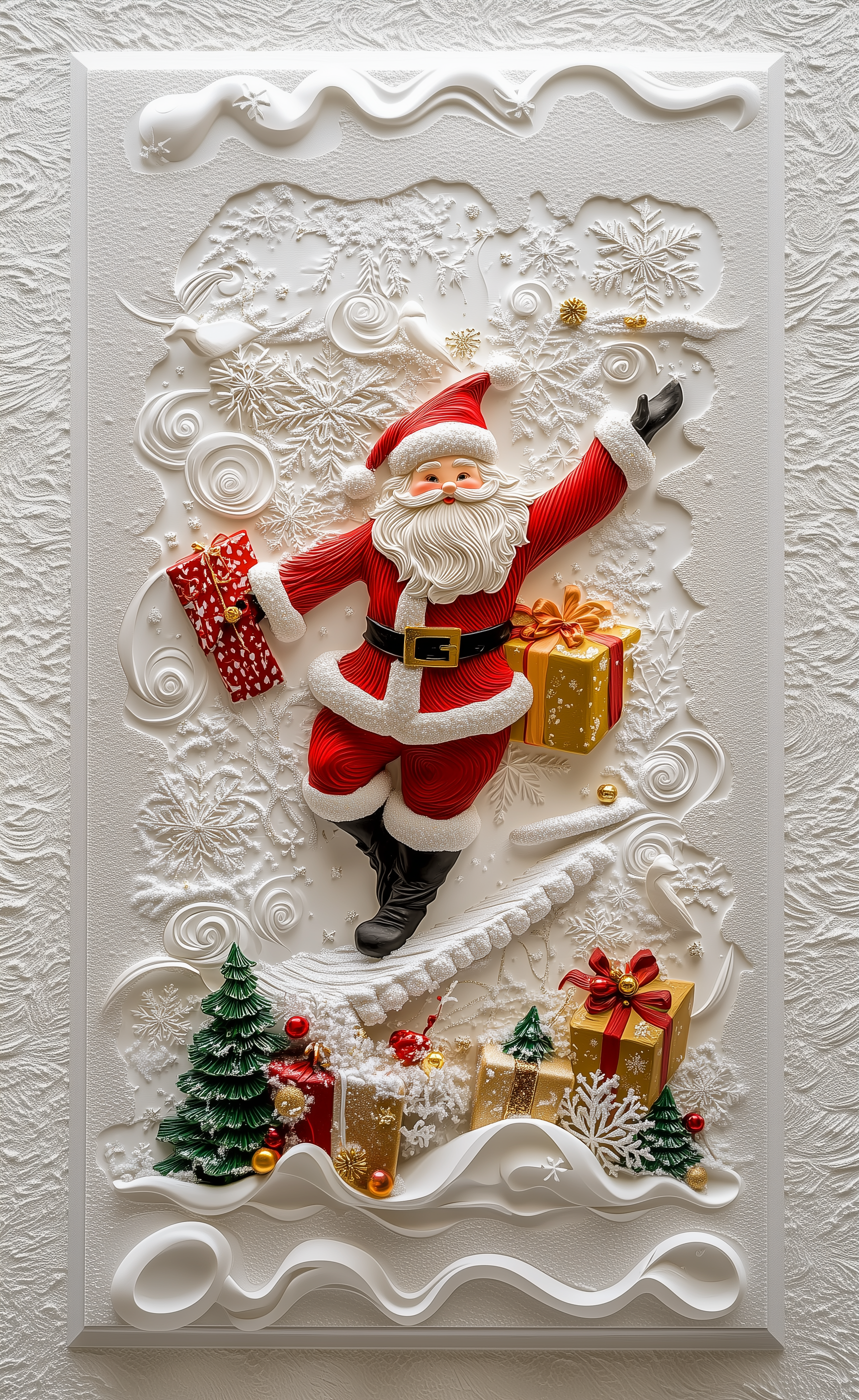This illustration features a 3D embossed design of Santa Claus walking on a roof with gift bags. The elegant Christmas decoration, surrounded by snowflakes, captures an enchanting festive spirit.