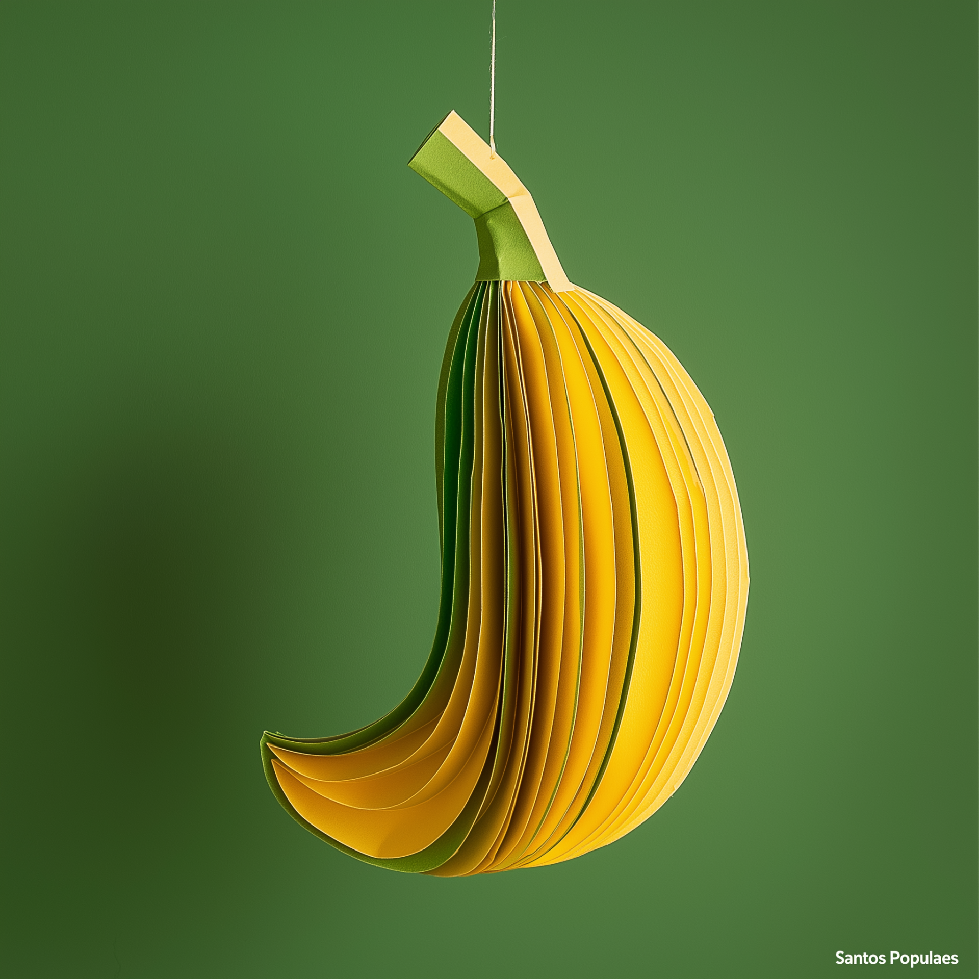 This image captures a vibrant and playful paper balloon shaped like a banana, exuding a cheerful vibe. The bright yellow and green colors coupled with the accordion folds give it a festive feel, reminiscent of traditional decorations.