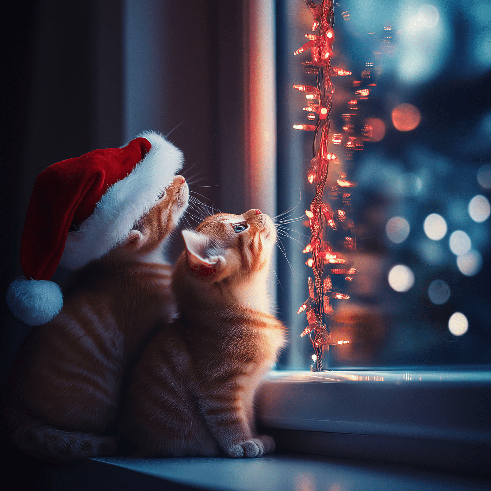 The image features adorable cats wearing festive Santa hats, gathered around a colorful fiber optic Christmas tree. The scene is cozy and cheerful, filled with the warmth of holiday spirit and wrapped presents.