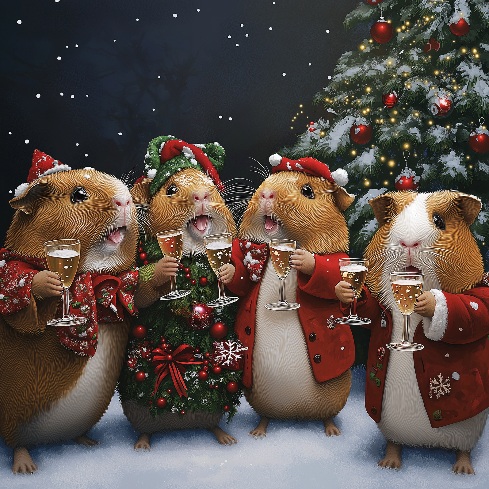 A festive scene where adorable guinea pigs are celebrating Christmas, each dressed in cheerful holiday attire. The warm ambiance is enhanced by a beautifully decorated Christmas tree and the joyful atmosphere of small animals toasting with champagne glasses.