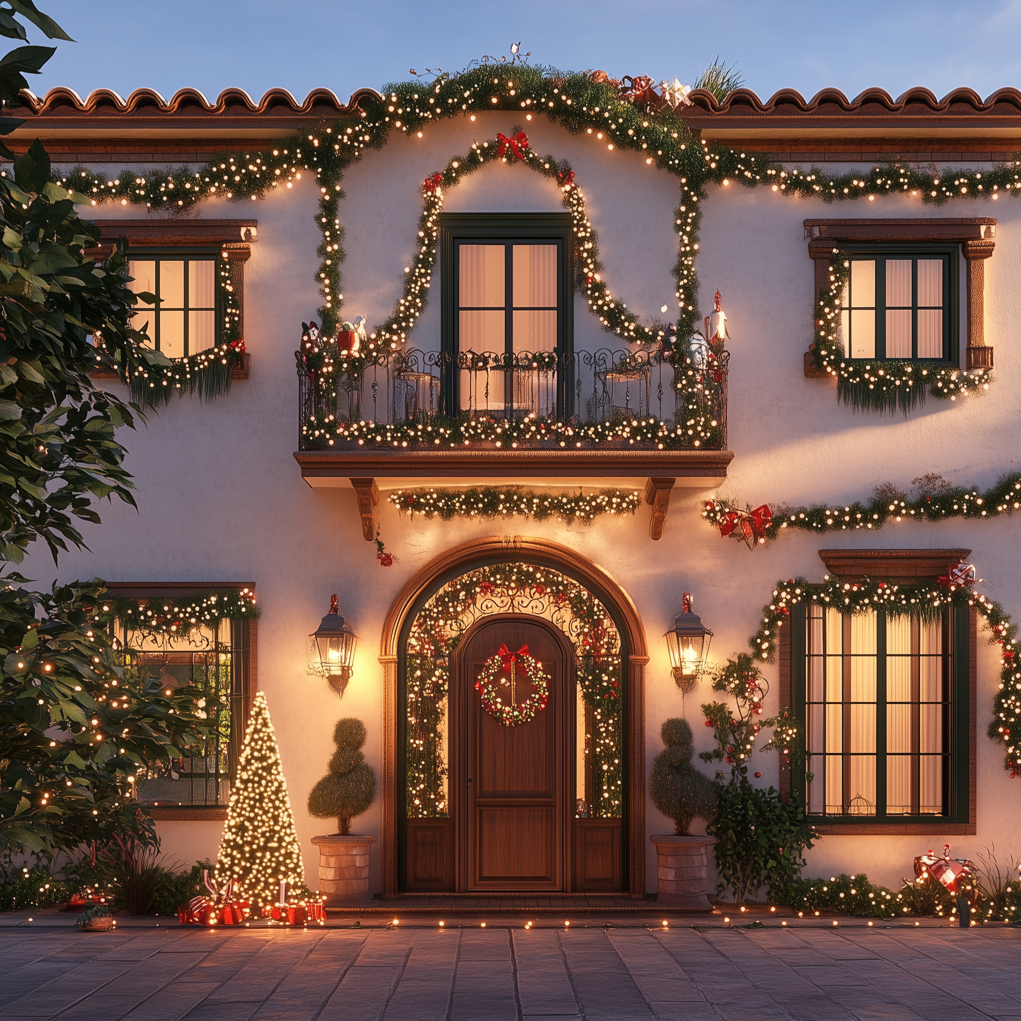 The image showcases a warm and inviting Latin house decorated for Christmas. Bright lights and green garlands adorn the windows, creating a festive atmosphere with a beautifully decorated Christmas tree visible inside.