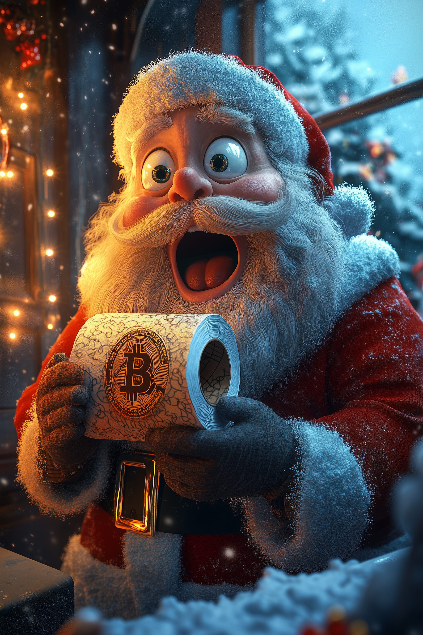 The illustration showcases a whimsical Santa Claus in a cozy bathroom setting, surrounded by festive decorations. Vibrant colors and a humorous twist on traditional holiday themes create a playful and contemporary atmosphere.