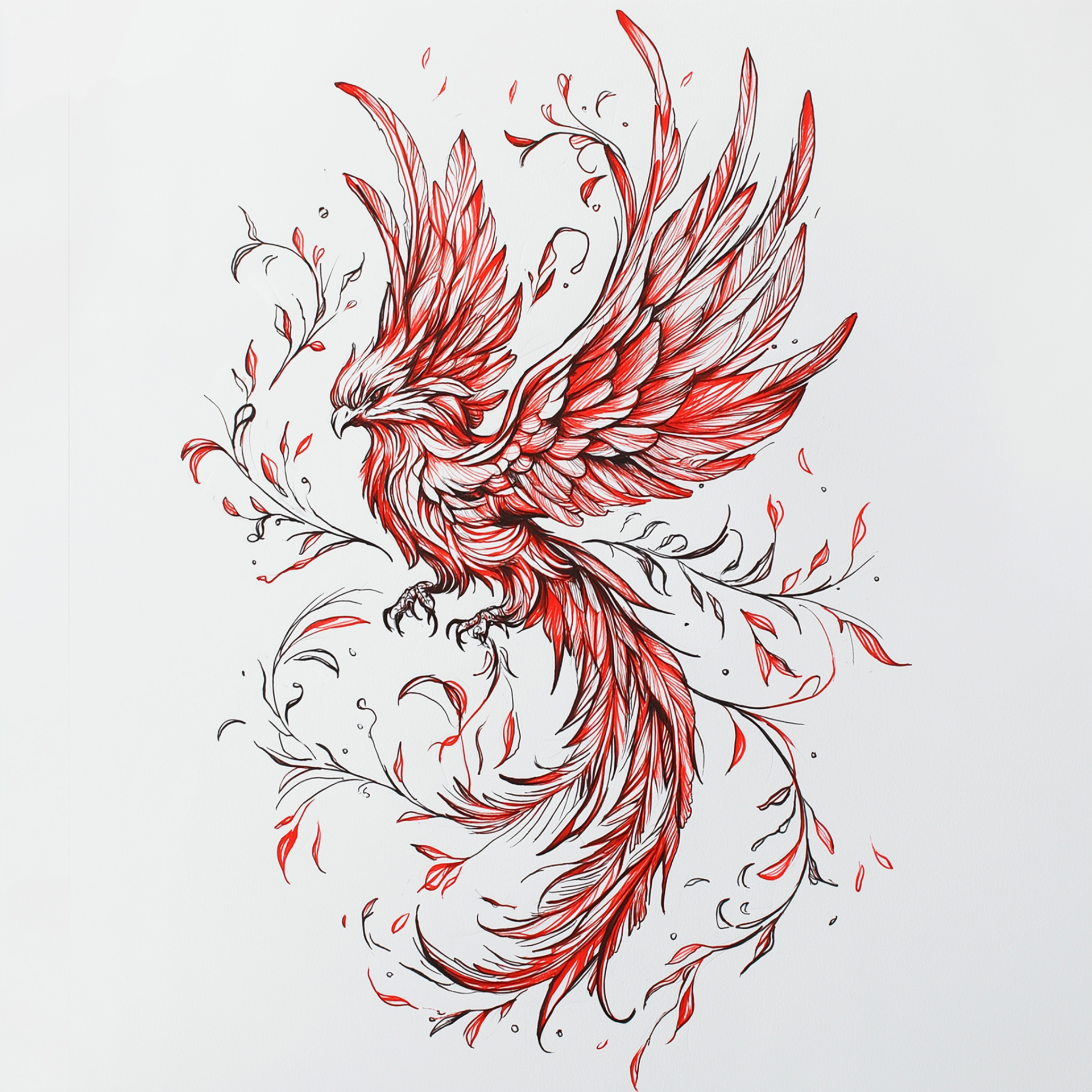 This illustration features a stylized phoenix bird created with intricate linework. The bird is adorned with vibrant red elements in its feathers, giving it a dynamic and fiery appearance.