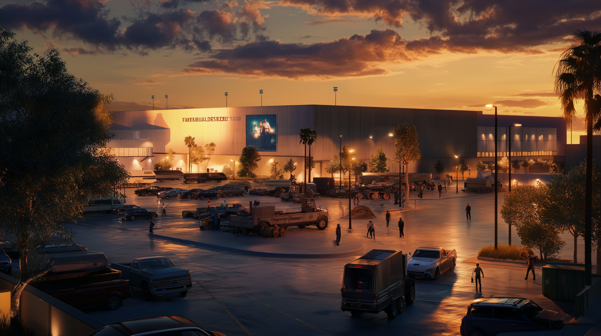 This wide shot captures the exterior of a state-of-the-art film studio as dusk settles in, creating a cinematic atmosphere. The hustle and bustle of the film studio complex is highlighted with various equipment and vehicles, showcasing the energetic environment of the filmmaking process.