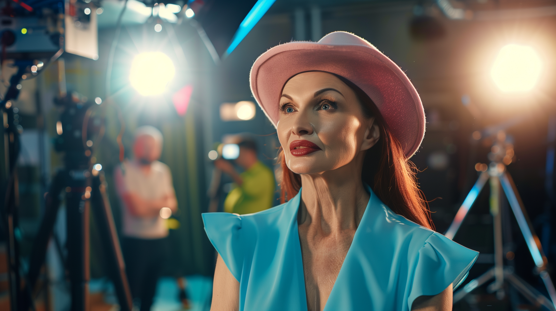 The image showcases a girl confidently giving an interview on a film set. Bright studio lights illuminate her face, creating a vibrant atmosphere filled with cameras and crew members in the background.