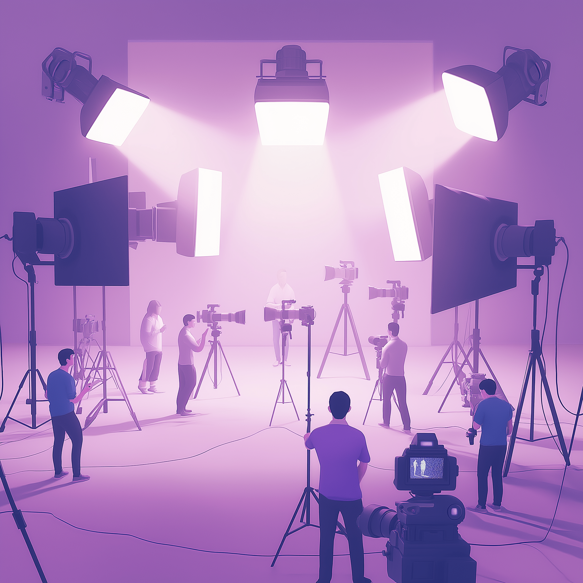 The image captures a vibrant movie shooting scene with crew members actively adjusting lights and cameras. The soft light purple background adds a dreamy and romantic atmosphere to the setting.