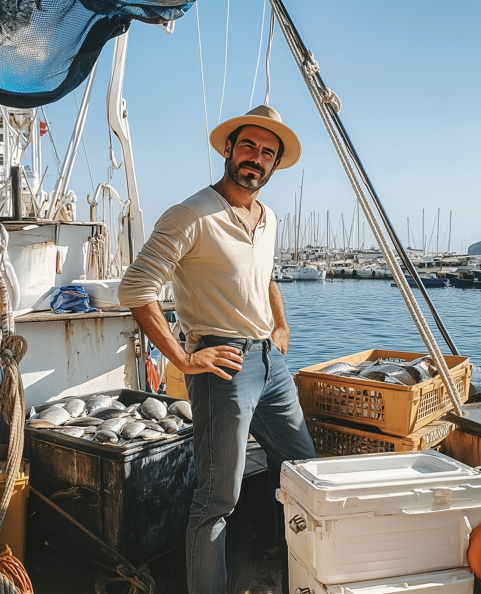 A young man stands casually on the deck of an old fishing boat, smiling as he takes a selfie. The sunny Mediterranean backdrop and the fresh catch of fish create a lively and vibrant atmosphere.