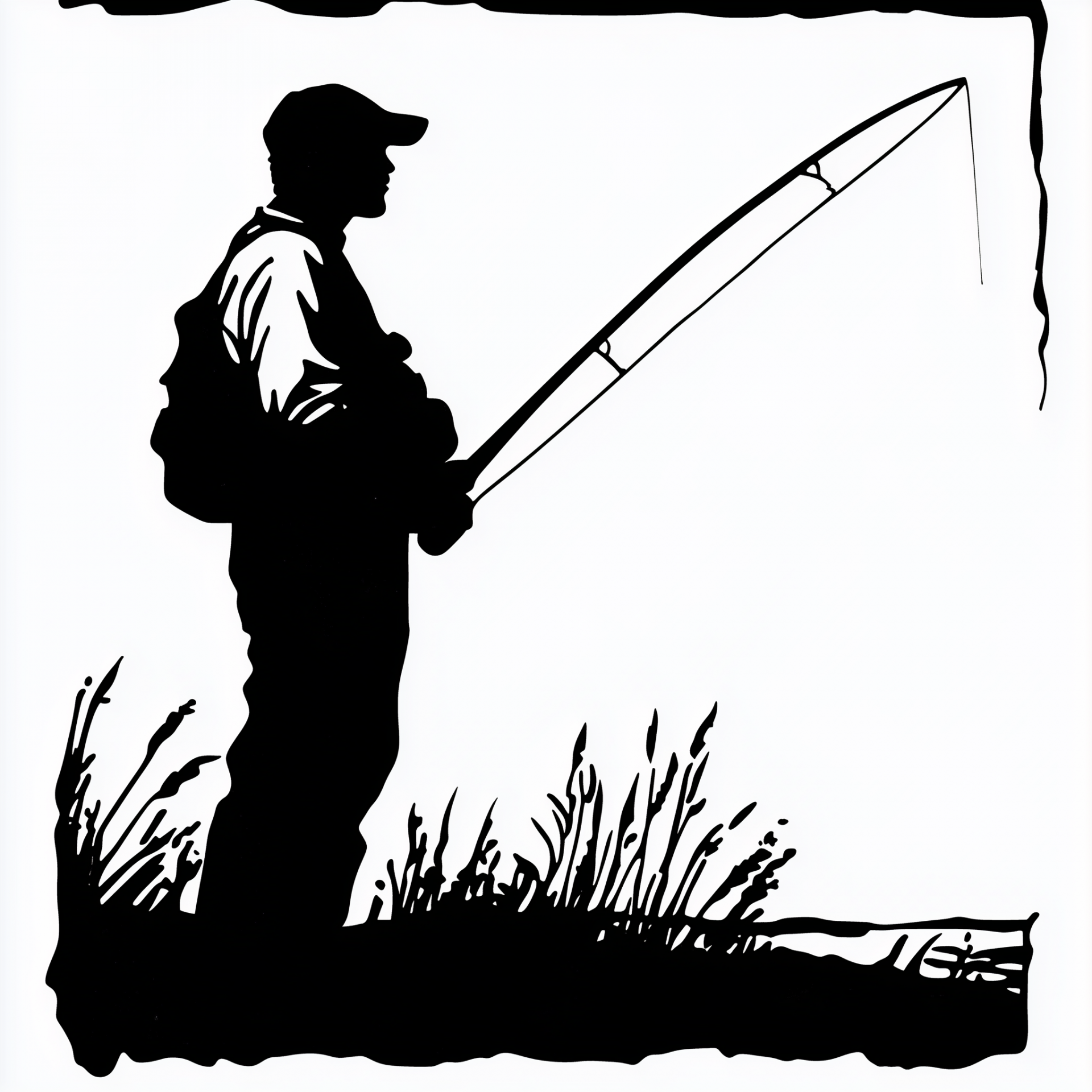 The image features a striking black silhouette of a man standing by the water, poised with his fishing pole extended as if casting into the distance. The background captures a serene environment, enhancing the calm and focused atmosphere of fishing.