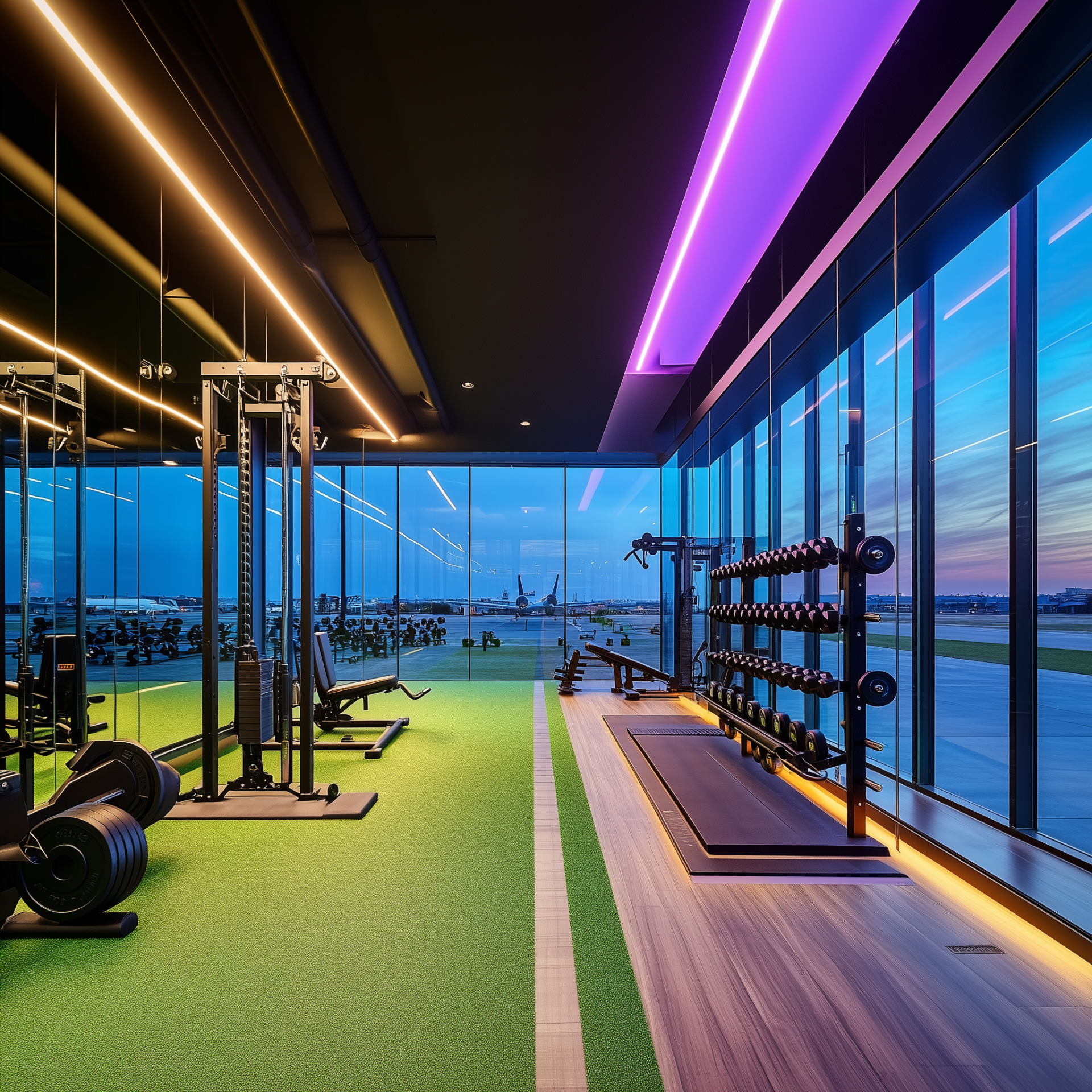 The image showcases a contemporary gym featuring a weight lifting area with a sleek design. Creative ambient lighting in light blue and purple tones fills the room, complemented by a large glass wall offering views outside.