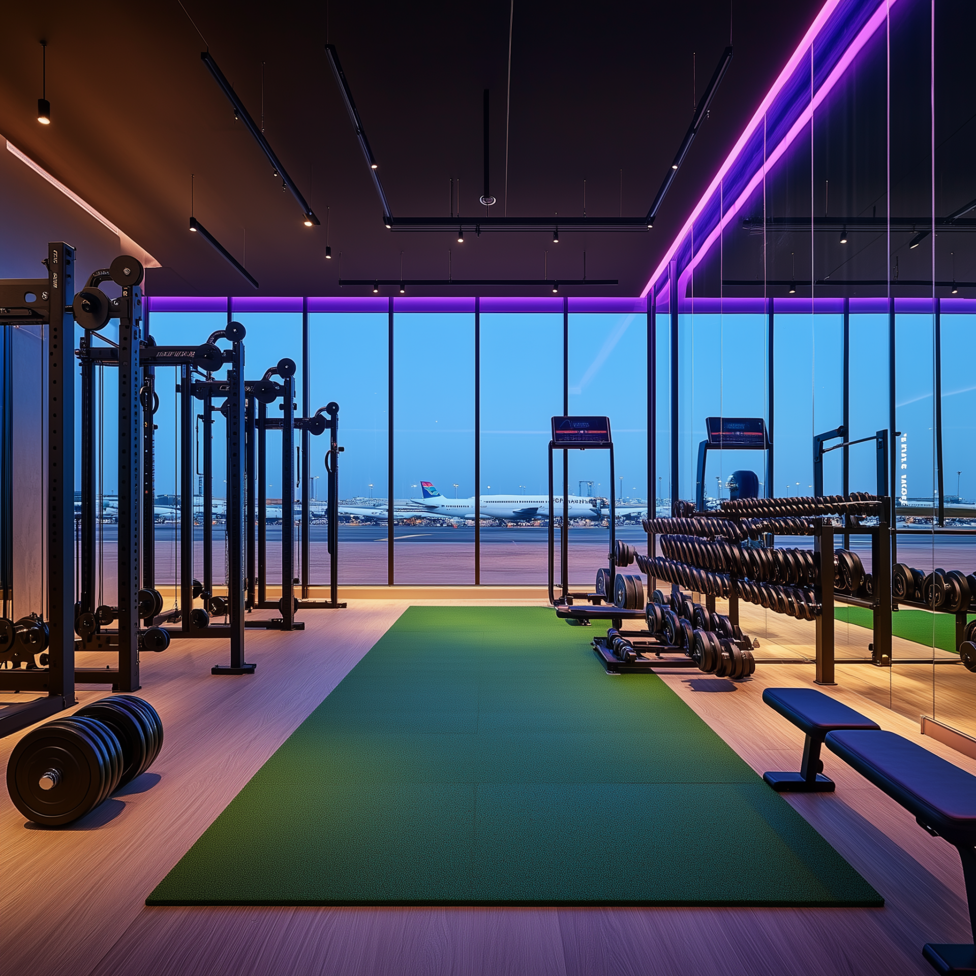 This image showcases a contemporary weight lifting room accentuated by sleek design elements. The vibrant blue and purple ambient lighting creates a dynamic atmosphere while a glass wall offers a unique view of airplanes.