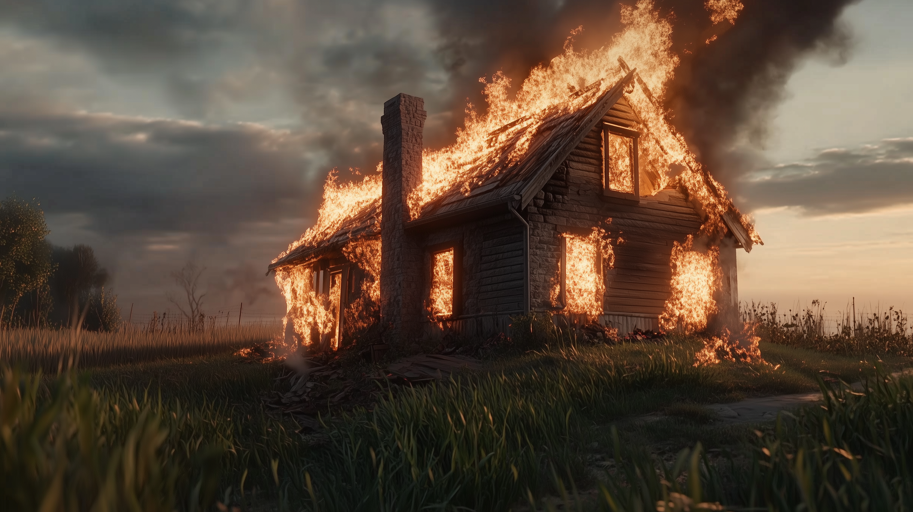 The image captures a dramatic scene of a house fully engulfed in flames, set against the backdrop of an open field. Bright orange and yellow hues illuminate the darkness, creating a stark contrast with the surroundings.
