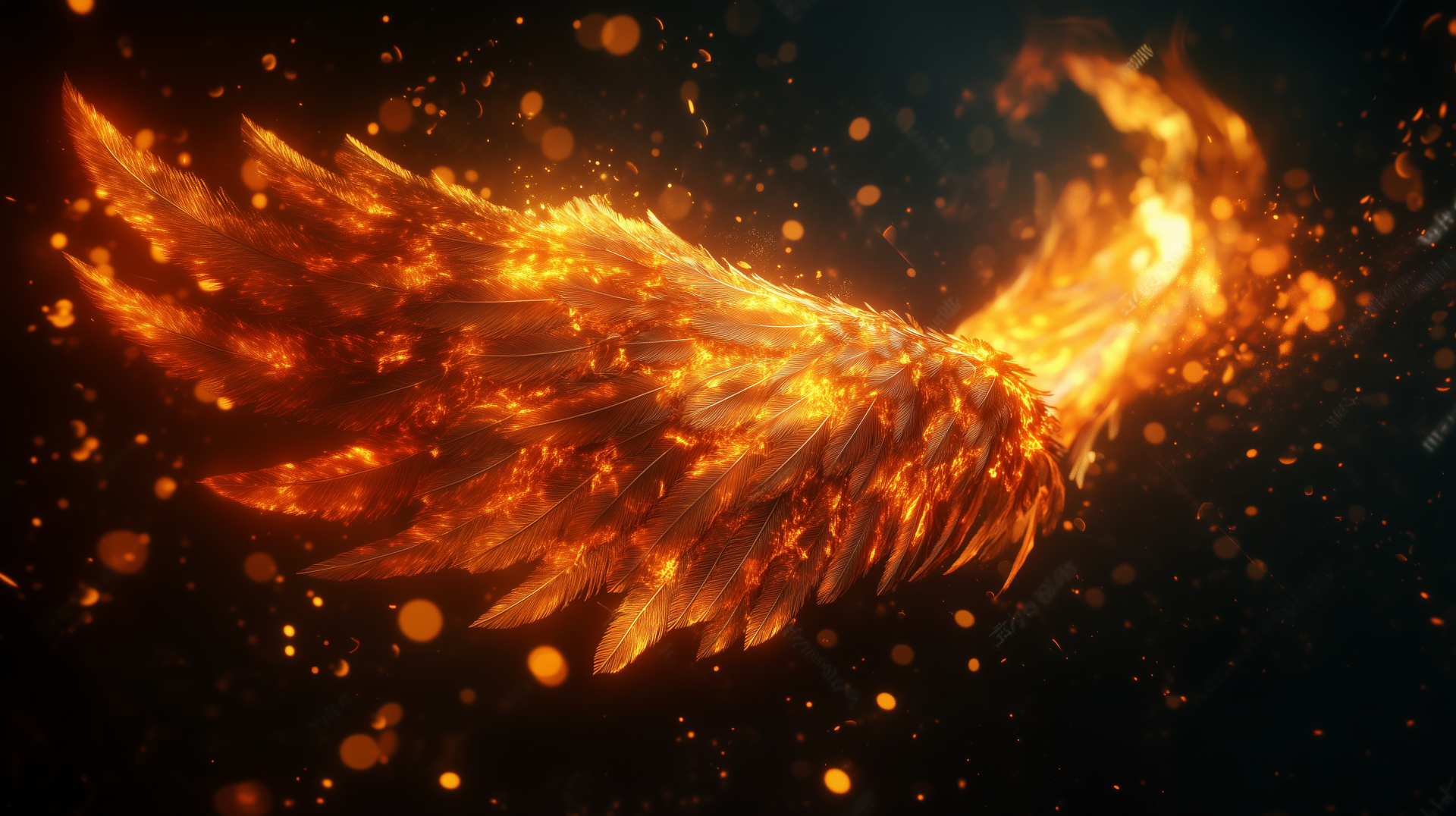 The image showcases large wings adorned with flames, creating a striking contrast against the black background. The fiery cinders and vibrant colors add a dynamic and intense feeling to the overall presentation.