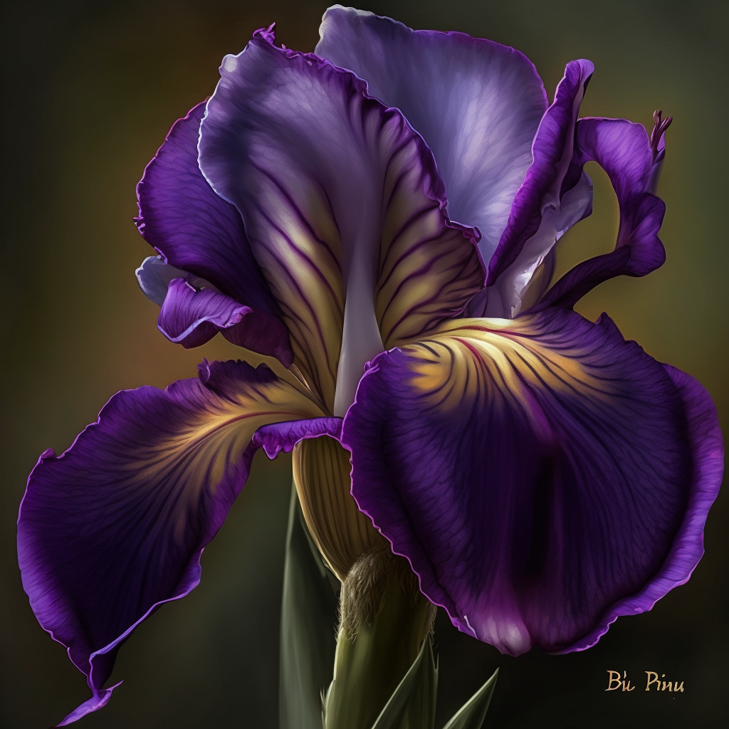 A striking purple iris flower stands out under the sunlight, showcasing vibrant colors and strong contrasts. The painting reflects a modern artistic style, emphasizing the beauty and intricacy of the flower.