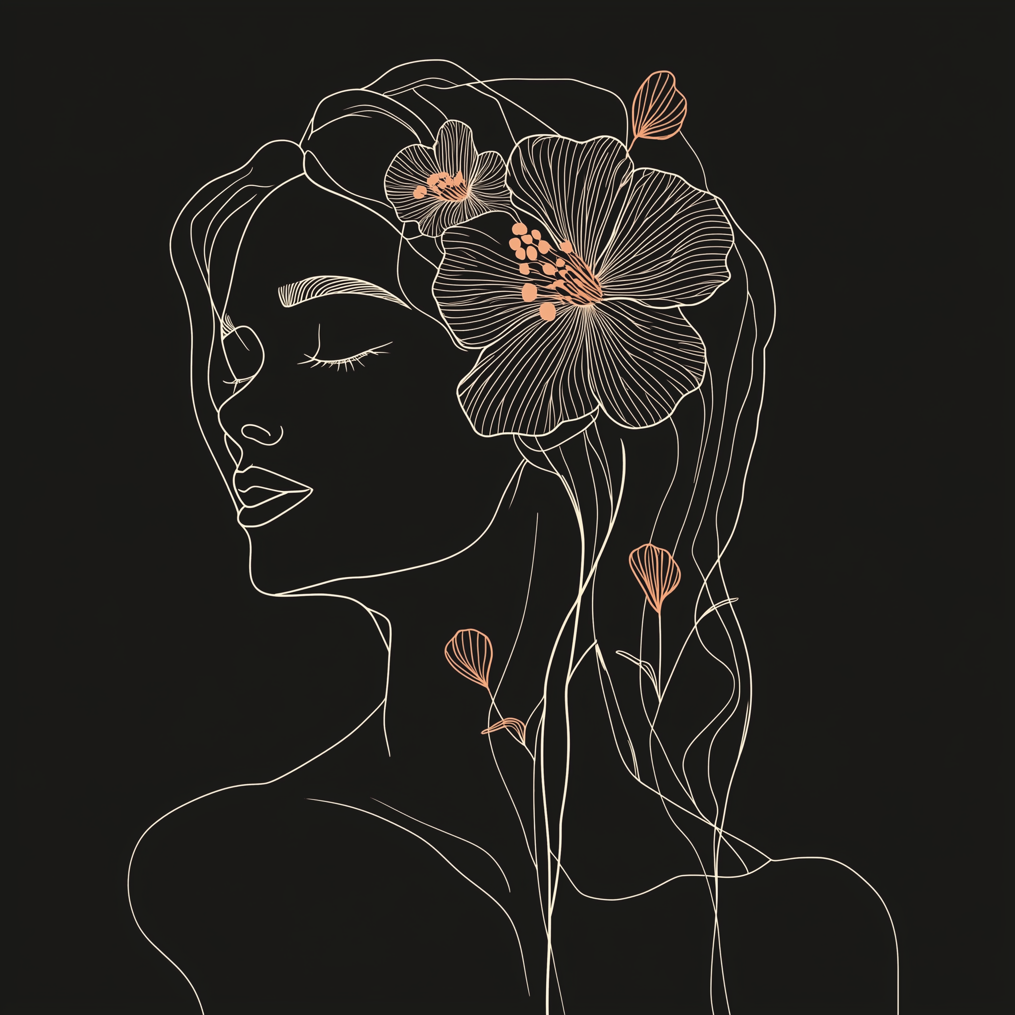 This illustration captures a girl adorned with delicate flowers in her hair, conveyed in a minimalist one-line style. The simplicity of the design evokes a sense of elegance and charm.