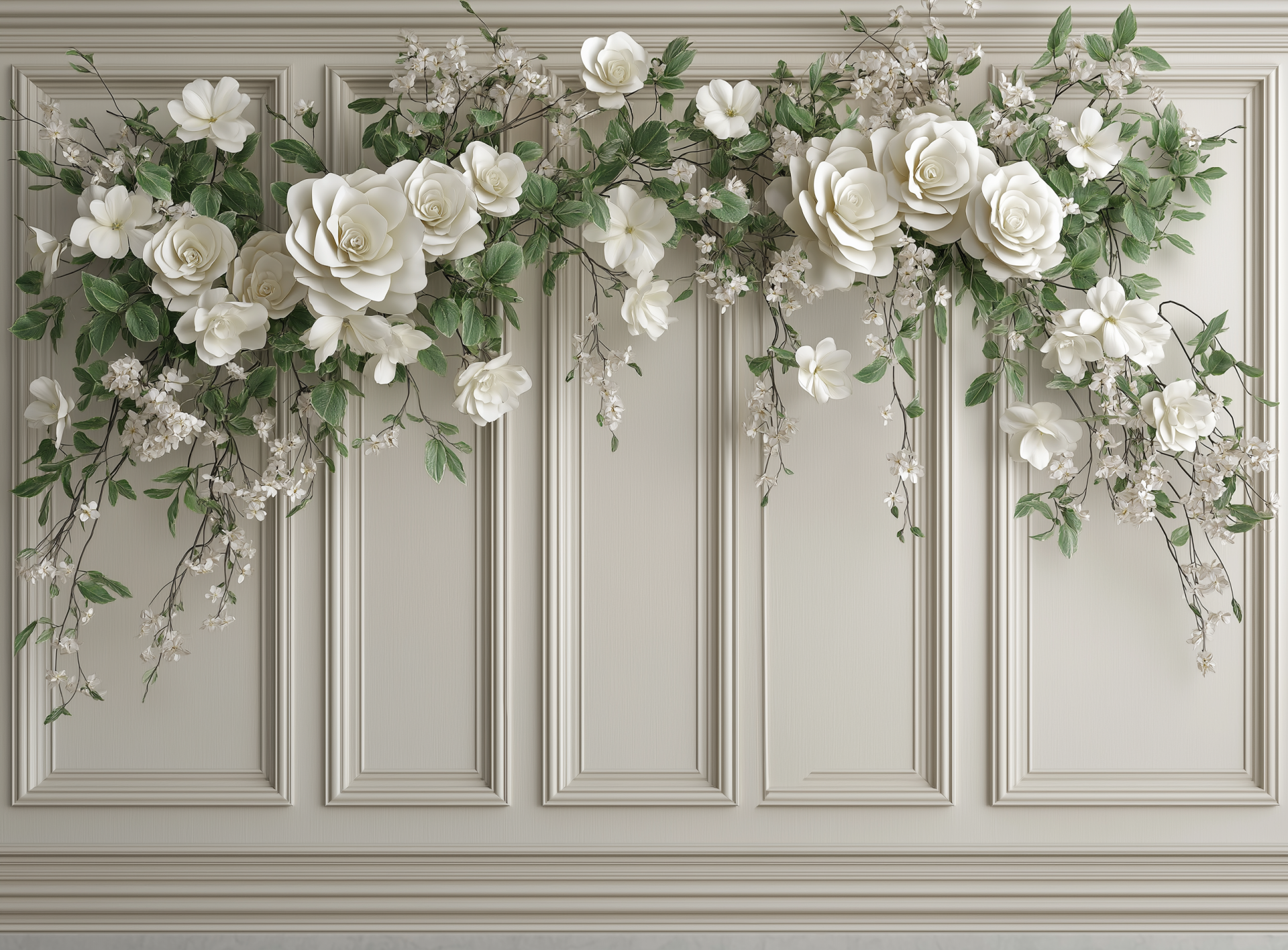 This image features a three-dimensional floral wall backdrop adorned with white and green flowers against a cream paneling. The overall aesthetic is clean and elegant, creating a serene environment perfect for various settings.