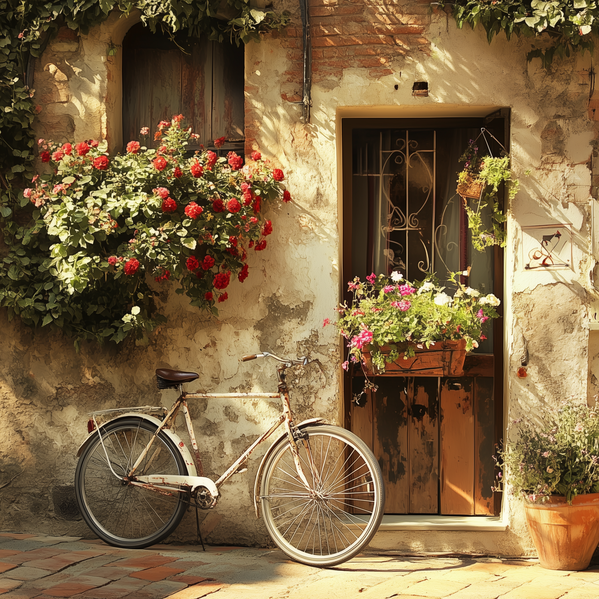A charming vintage bicycle is beautifully positioned in front of a quaint Italian house adorned with colorful flowers. The overall feel of the image is painterly, evoking a sense of nostalgia and warmth.