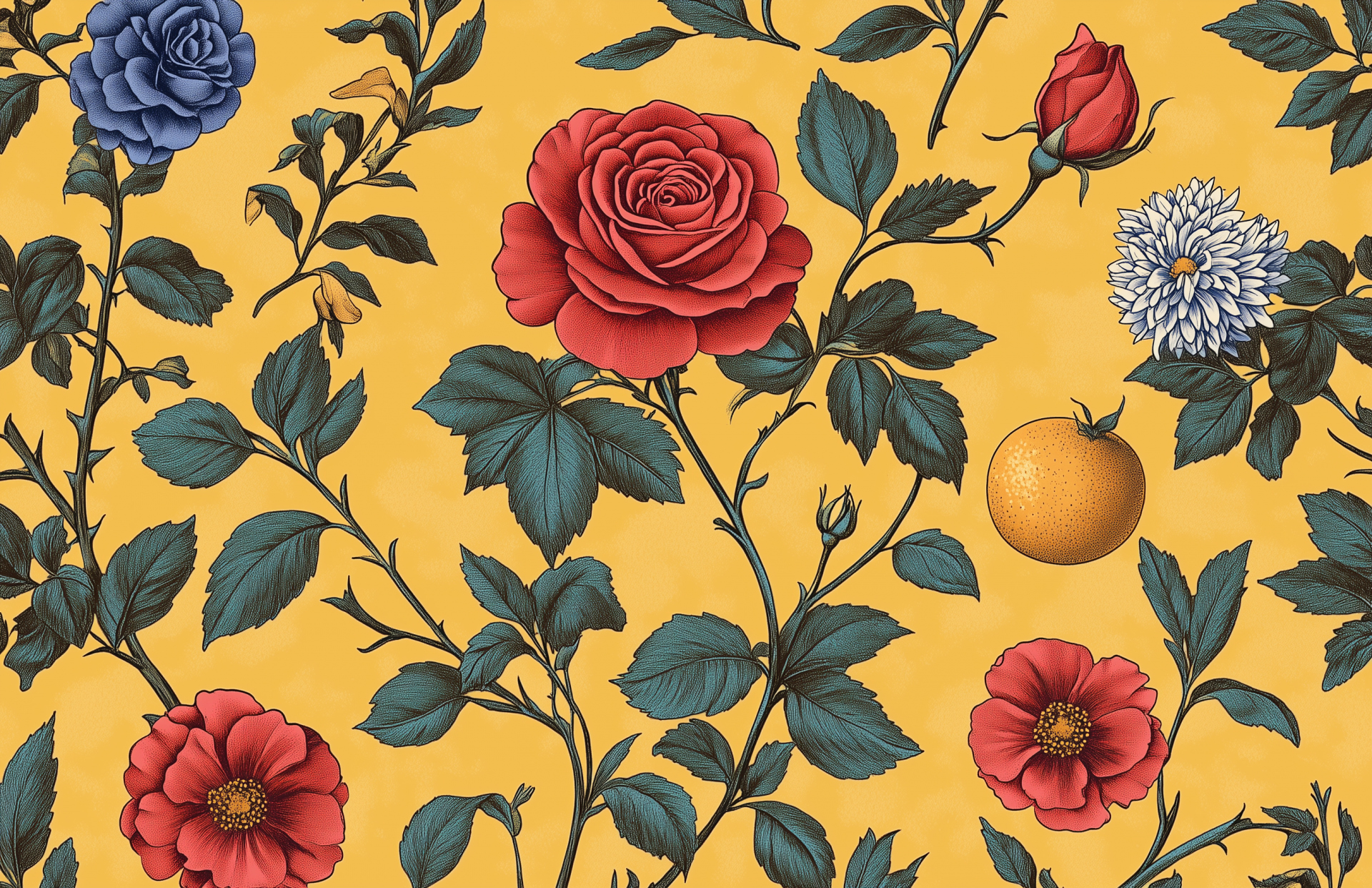 The image showcases a seamless pattern filled with beautifully detailed vintage botanical illustrations. The colored pencil style enhances the intricate details of the roses, chrysanthemums, and oranges against a cheerful mustard yellow background.
