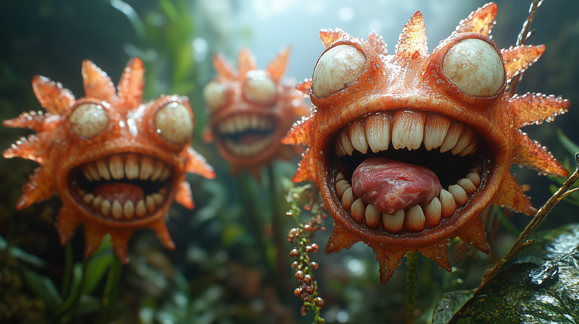 This image captures a surreal blend of hyper-realistic flowers that possess mouths, giving them a striking and unusual appearance. The ultra-detailed rendering brings out intricate textures and realistic lighting, creating an eye-catching visual impact.
