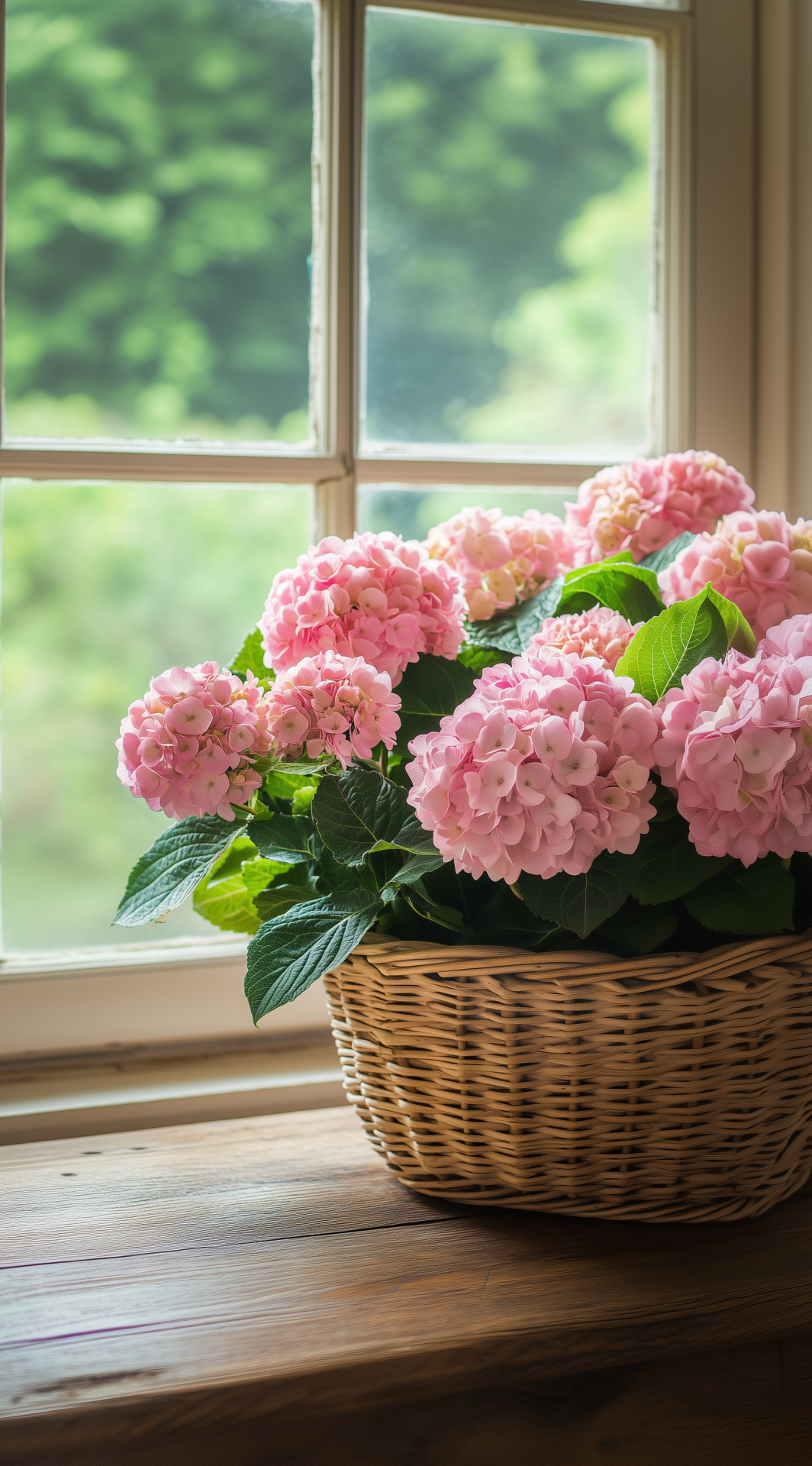 A large basket filled with vibrant pink hydrangeas rests on a table by the window. The delicate petals and lush green leaves create a serene and inviting atmosphere.