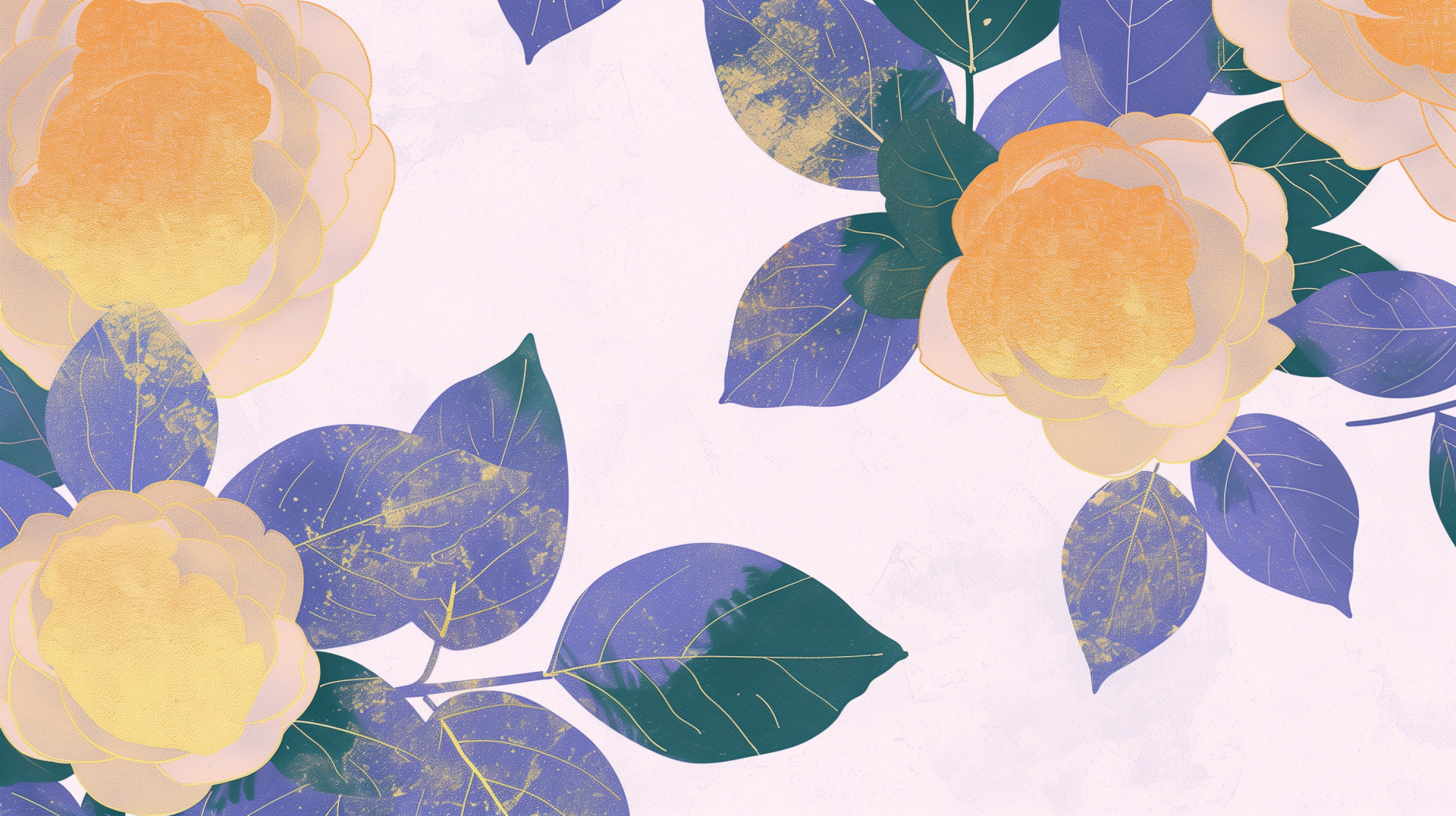 This image features a light color oil painting of Camellia japonica, showcasing a delicate and ornamented pattern. The design is set against a crisp white background, enhancing the floral motifs and providing a sense of tranquility.