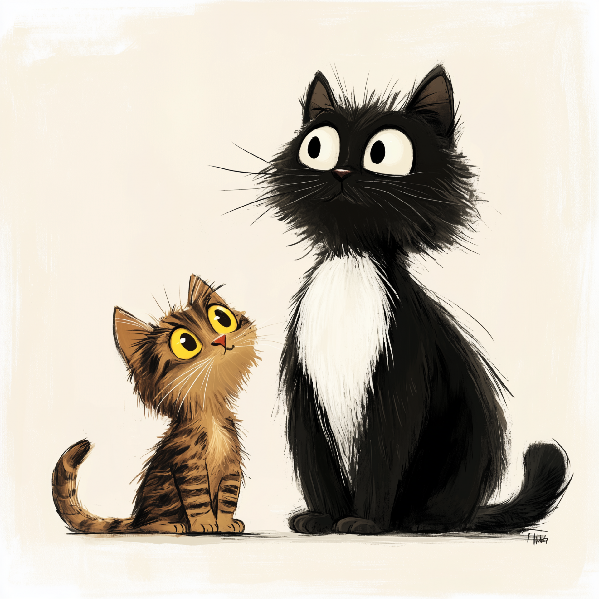 This whimsical image features a brown tabby kitten with an exceptionally fluffy tail sitting beside a large tuxedo cat. The design evokes a Tim Burton style with its quirky characters and playful atmosphere.