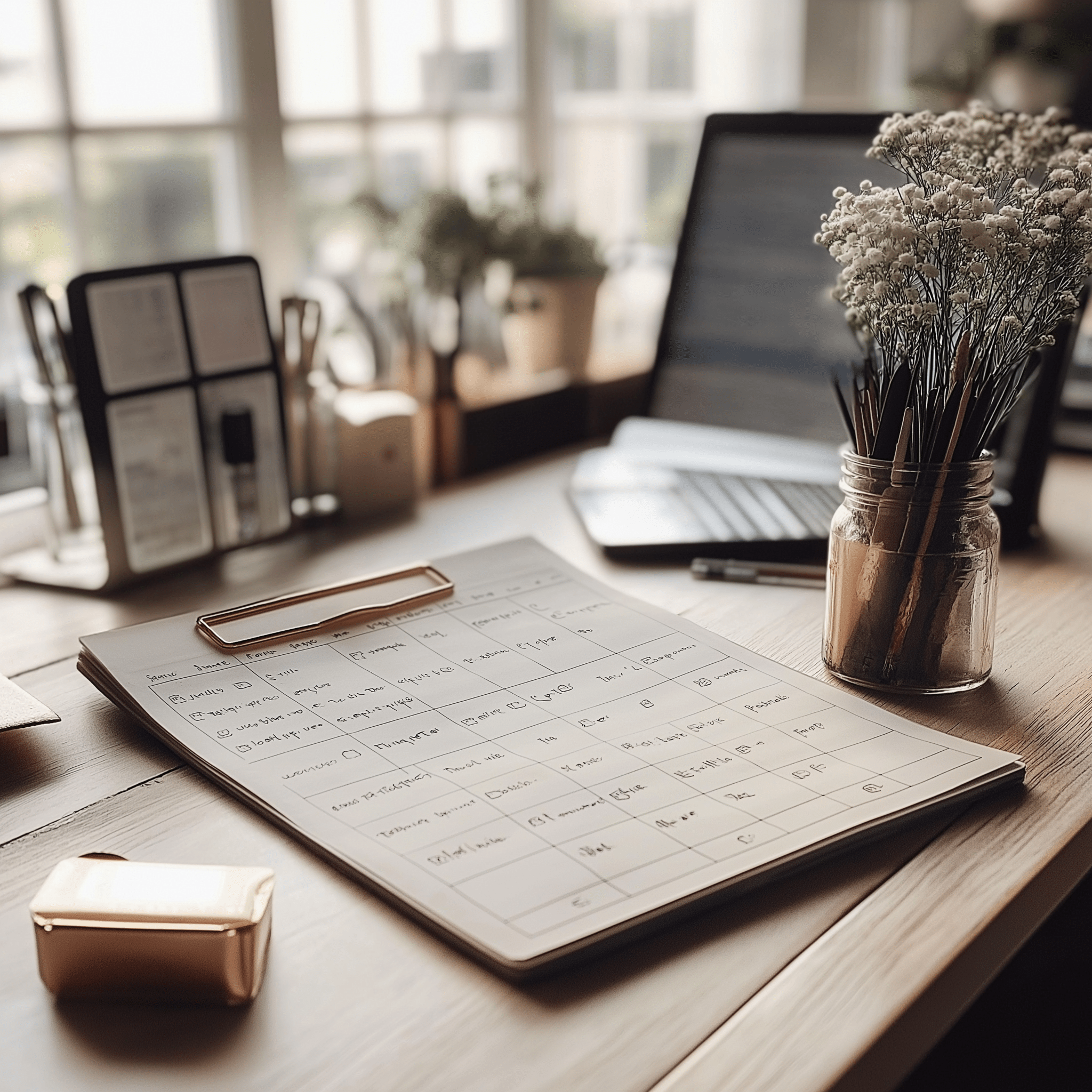 The image showcases a neatly arranged weekly planner on a serene and clutter-free workspace. The calm aesthetic and organized layout convey a sense of preparation and focus.