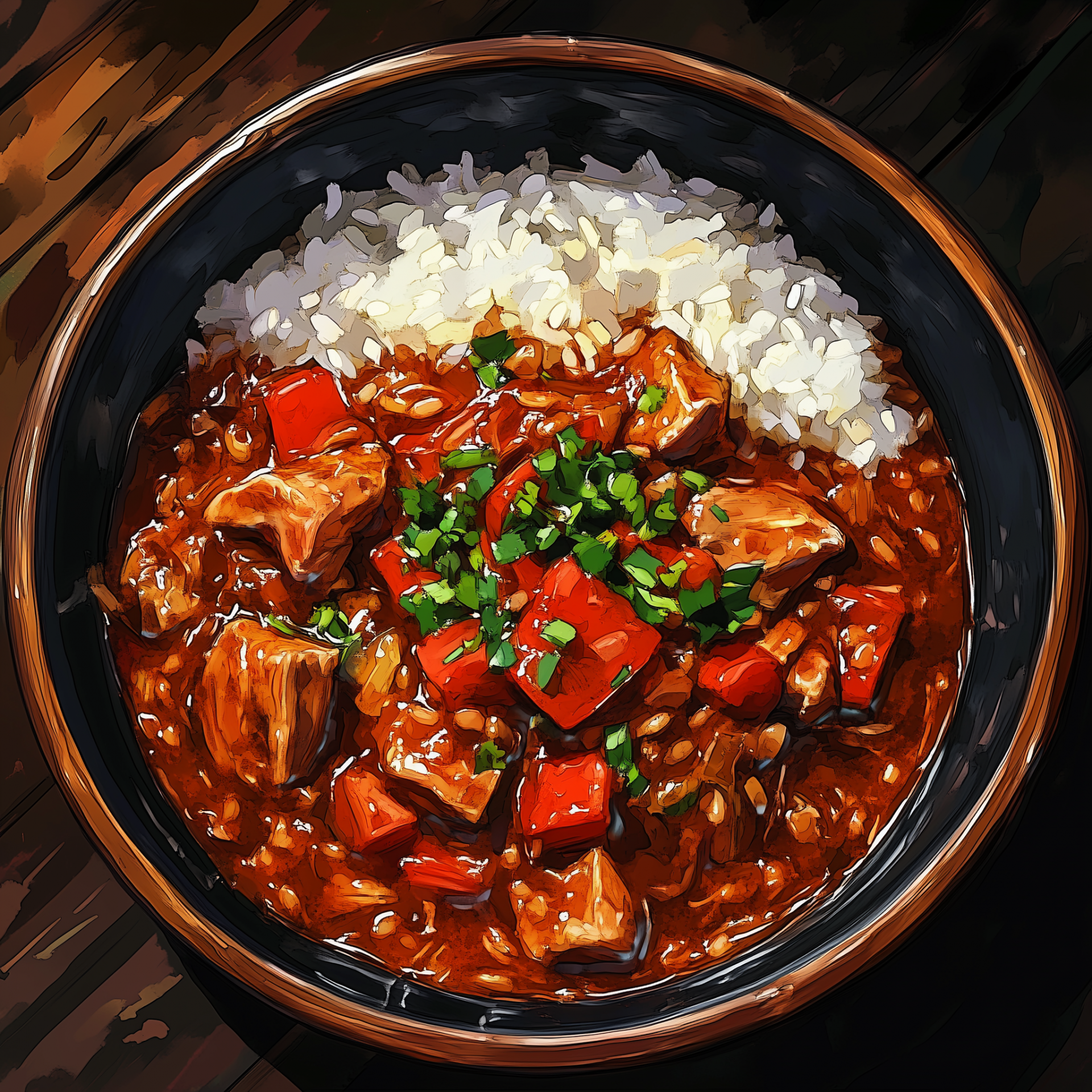 This illustration features a vibrant bowl of braised chicken chili accompanied by rice, set against a stark black background. The artwork embodies a cartoonish comic book style with warm colors, creating an inviting and playful atmosphere.