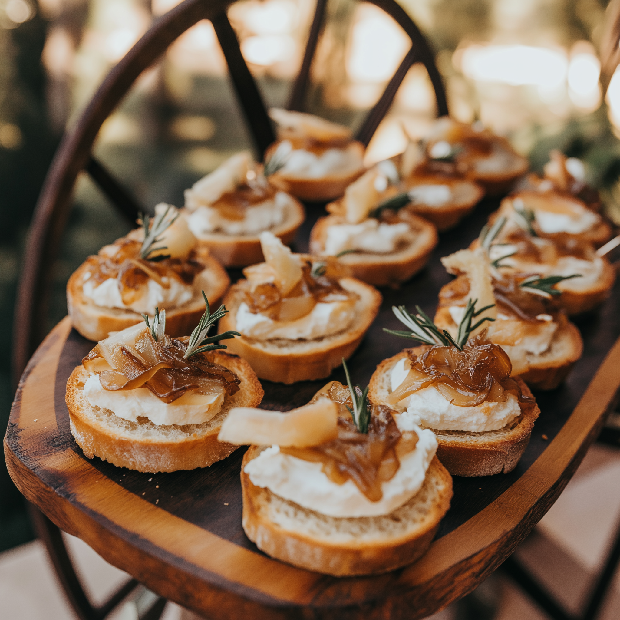 This image showcases a beautifully arranged platter of caramelized onion goat cheese crostini set against a whimsical ferris wheel backdrop. The bohemian-themed table decor adds a warm and inviting atmosphere, perfect for gatherings.