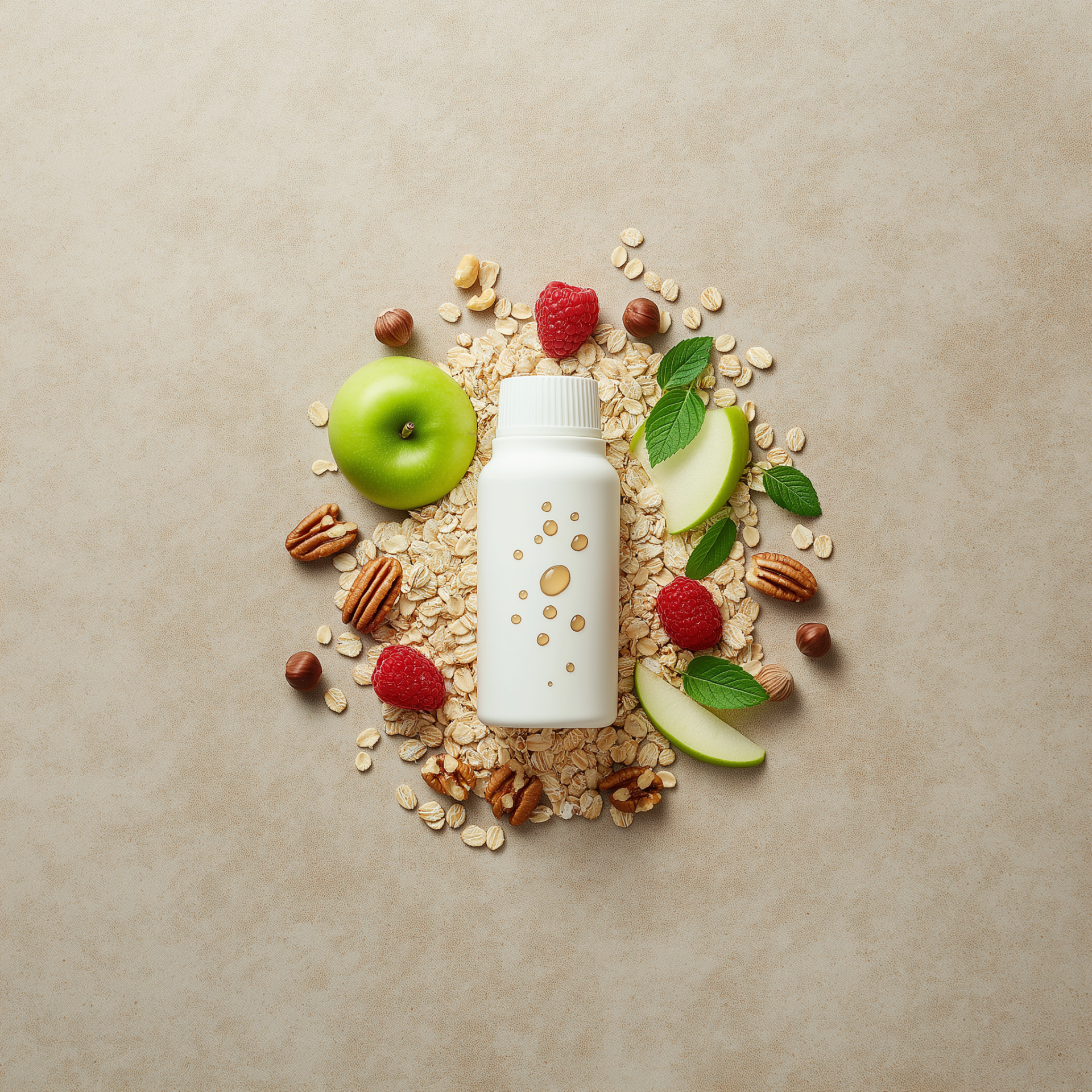 The image presents a top view of a white plastic bottle surrounded by an artistic arrangement of oats and fresh ingredients. The clean and minimalistic style emphasizes the vibrant colors of the apple slices, raspberries, and the natural textures of honey, peanut butter, and nuts against the beige background.