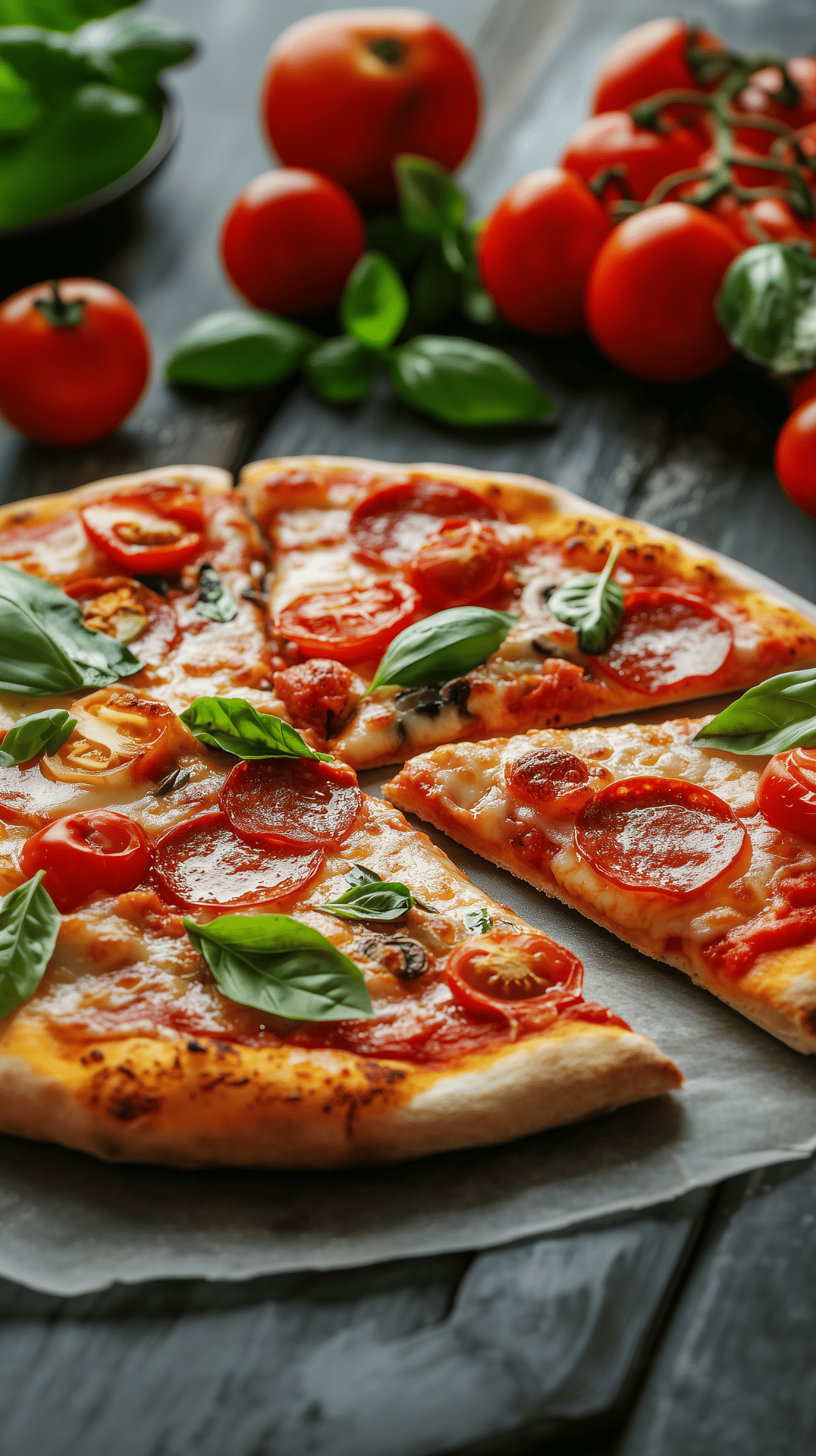 This image features a vibrant pizza with a golden, crispy crust. Colorful toppings of fresh vegetables, pepperoni, and melted cheese create an appetizing presentation.