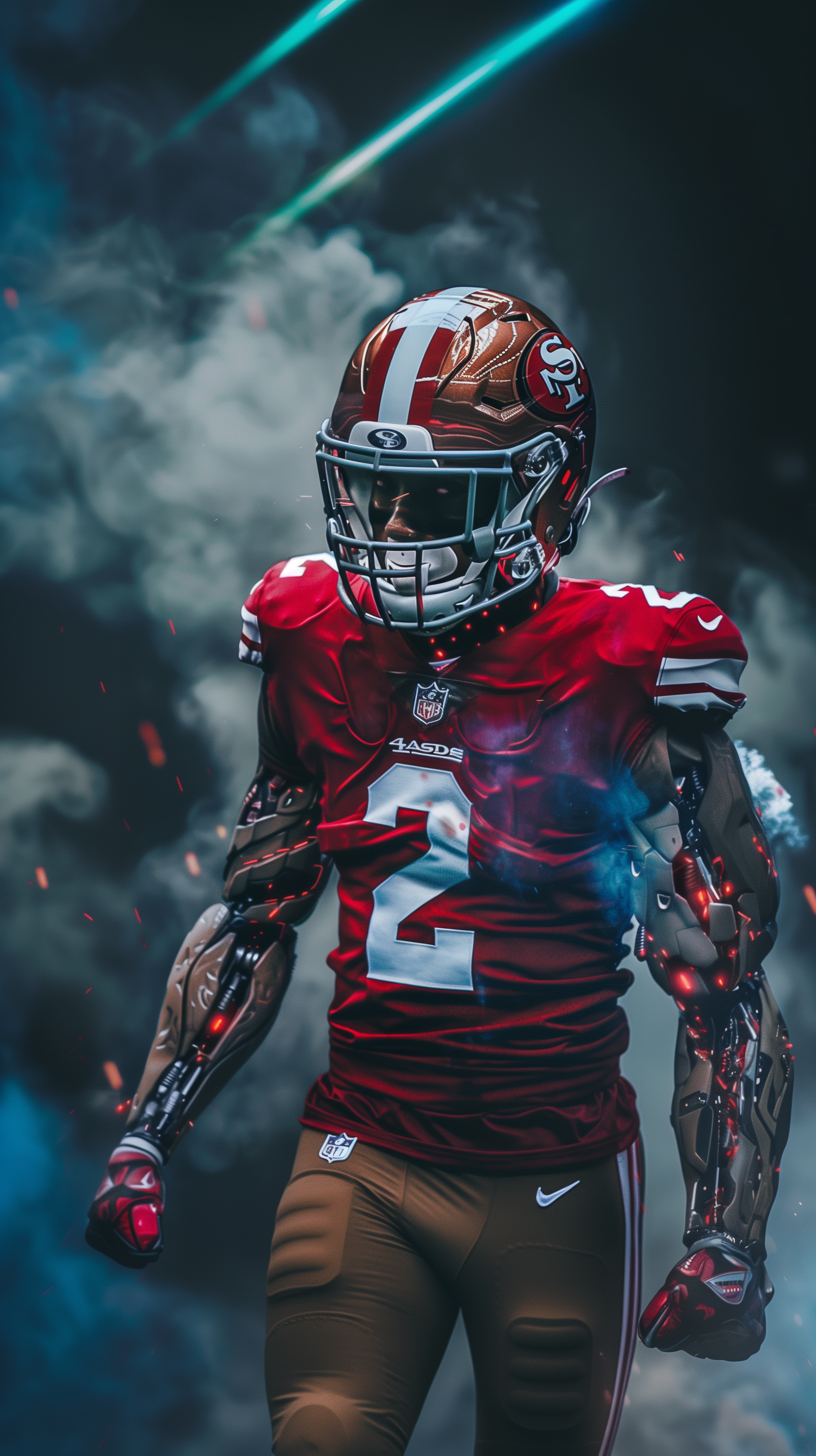 This illustration presents a fierce cyborg with a menacing appearance, blending elements of a football player and a robotic entity. The figure is adorned with armor and glowing elements that give it an otherworldly presence, enhancing the intensity and strength of the character.
