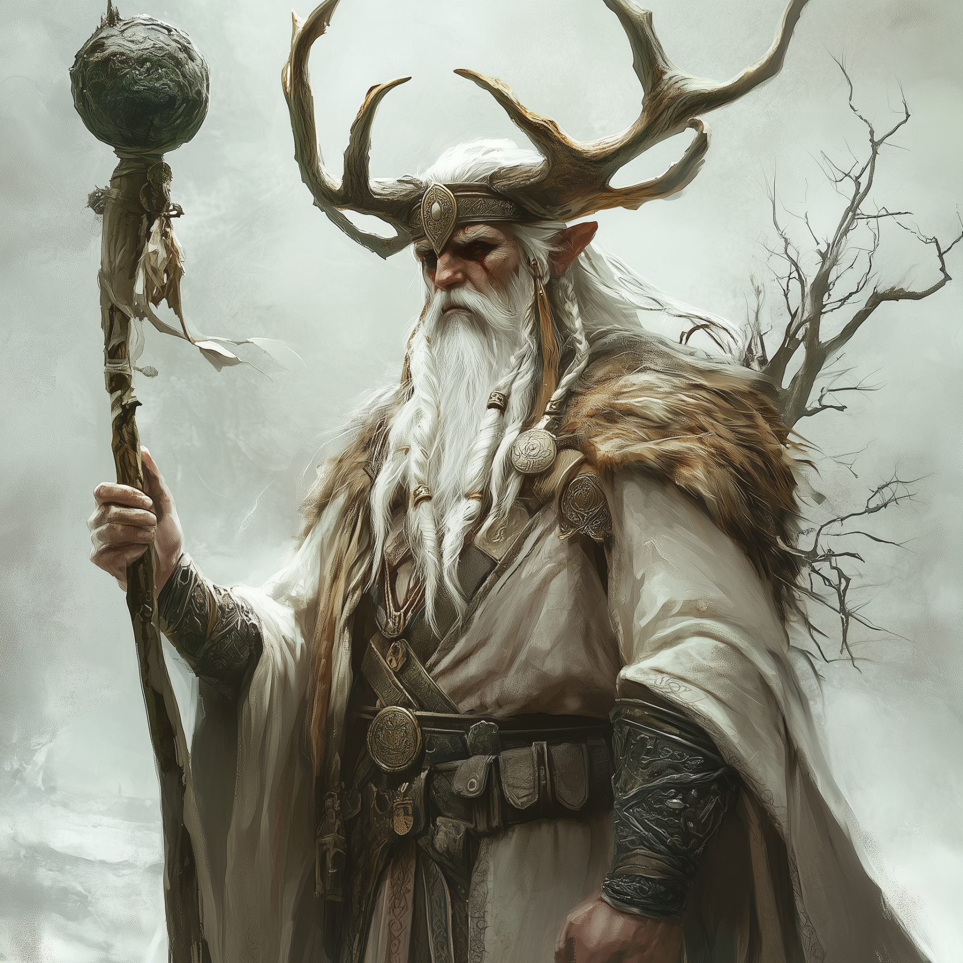 The illustration depicts a group of druids in a serene forest setting, surrounded by lush greenery and mystical elements. The scene evokes a sense of harmony with nature, filled with a sense of ancient wisdom and tranquility.