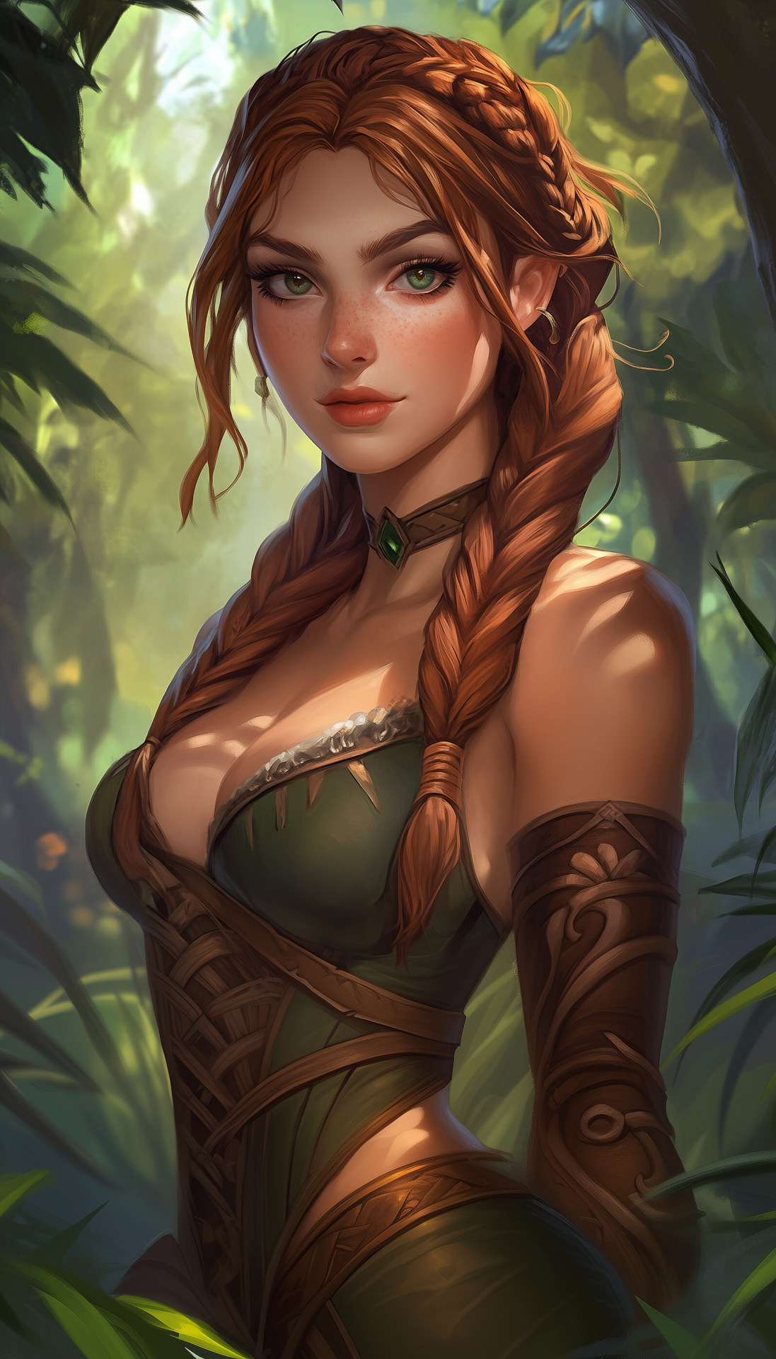 The image depicts a mystical female Dryad standing gracefully among lush trees, with sunlight filtering through the leaves creating a magical atmosphere. The vibrant colors and intricate details of the foliage enhance the enchanting feeling of the forest.