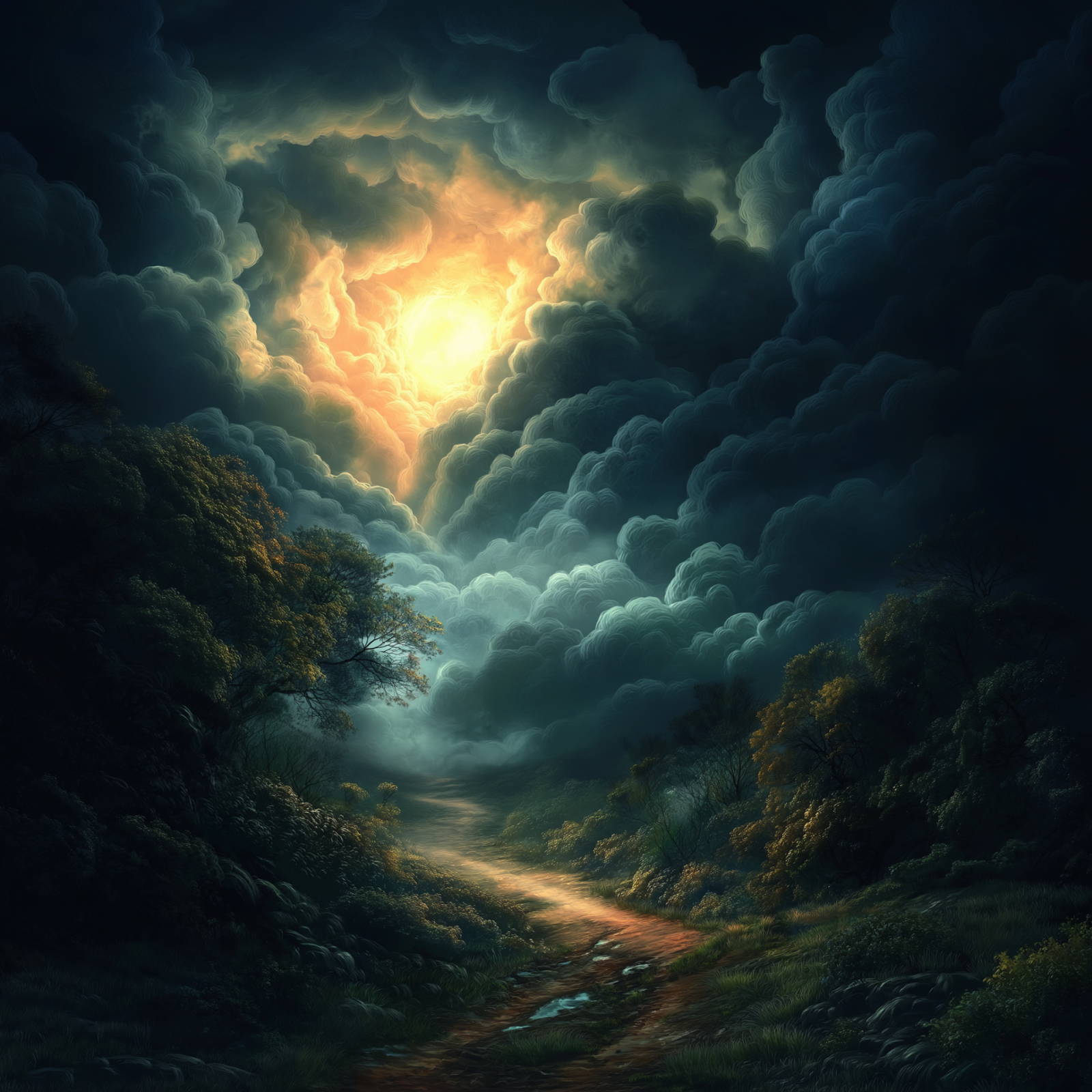 The image depicts a brilliant glow of light piercing through ominous storm clouds, casting a warm illumination onto a shadowy forest beneath. This ethereal sight evokes a sense of hope and perseverance amidst the turmoil of nature.