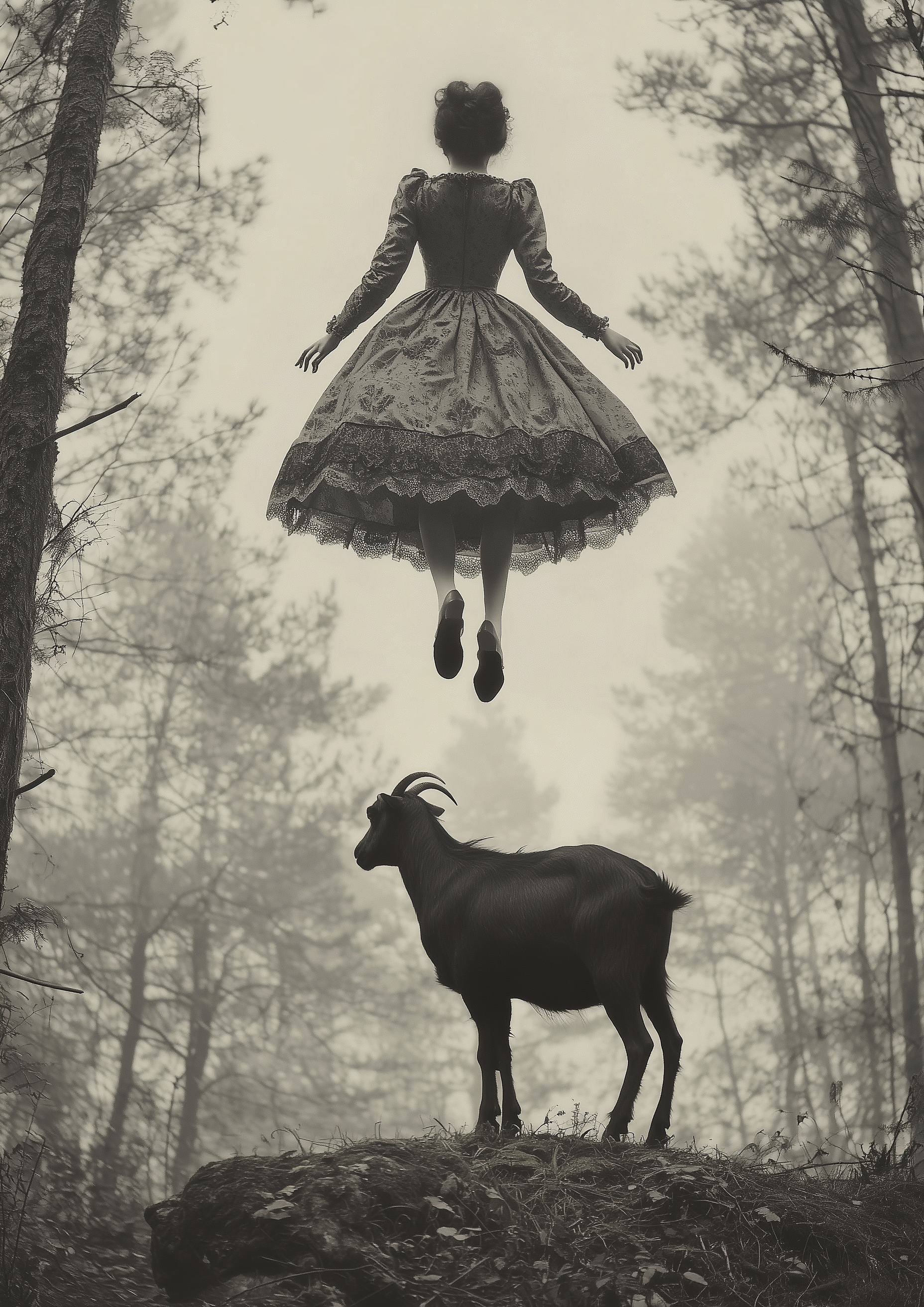 A haunting black and white photograph captures a girl dressed in a Victorian-era gown, gracefully floating above a black goat. The serene forest setting adds a mystical atmosphere to the scene, emphasizing the contrast between light and shadow.