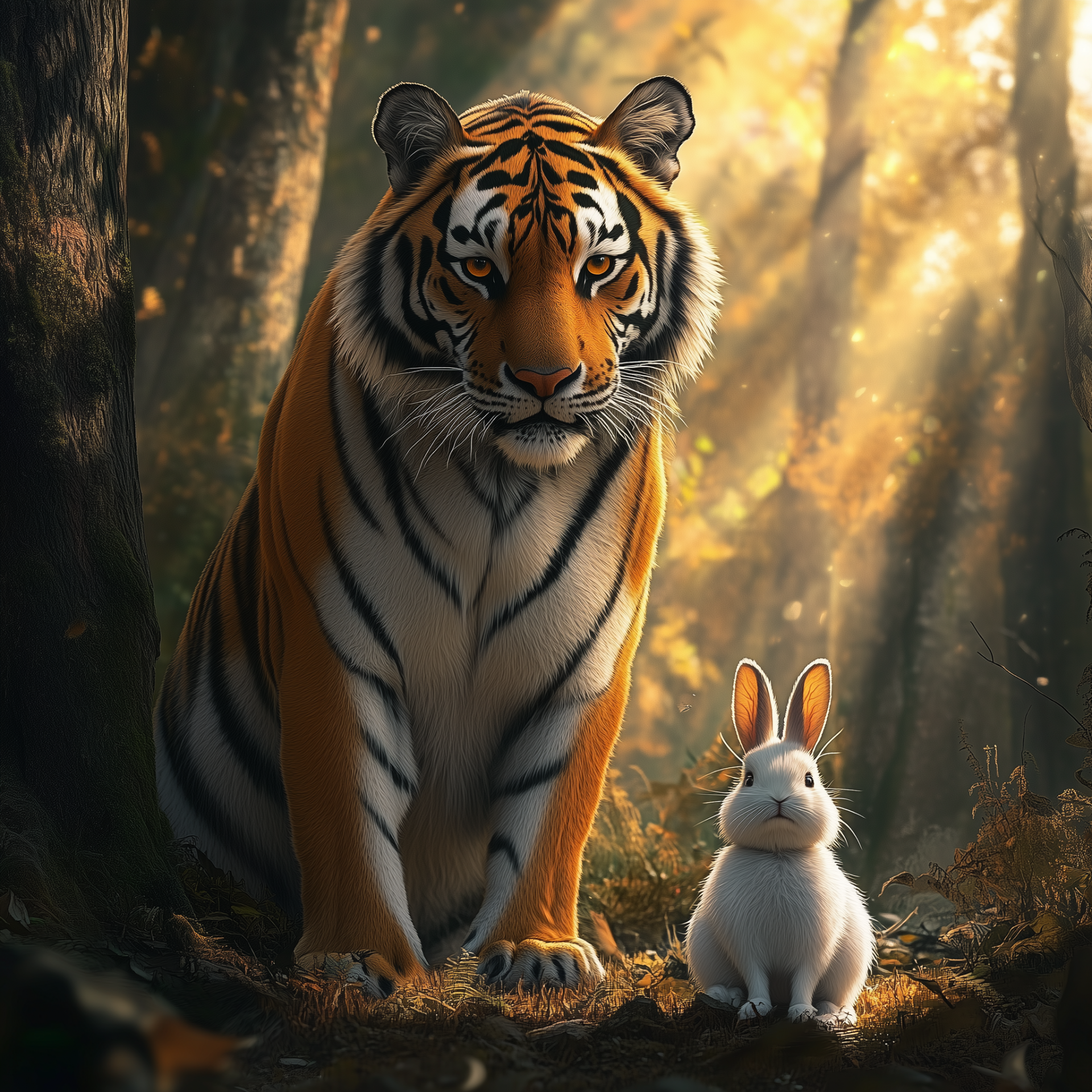 This image depicts a majestic tiger standing next to a small fluffy rabbit in a tranquil forest setting. The contrasting colors and textures of the animals showcase their unique beauty in a peaceful and harmonious atmosphere.