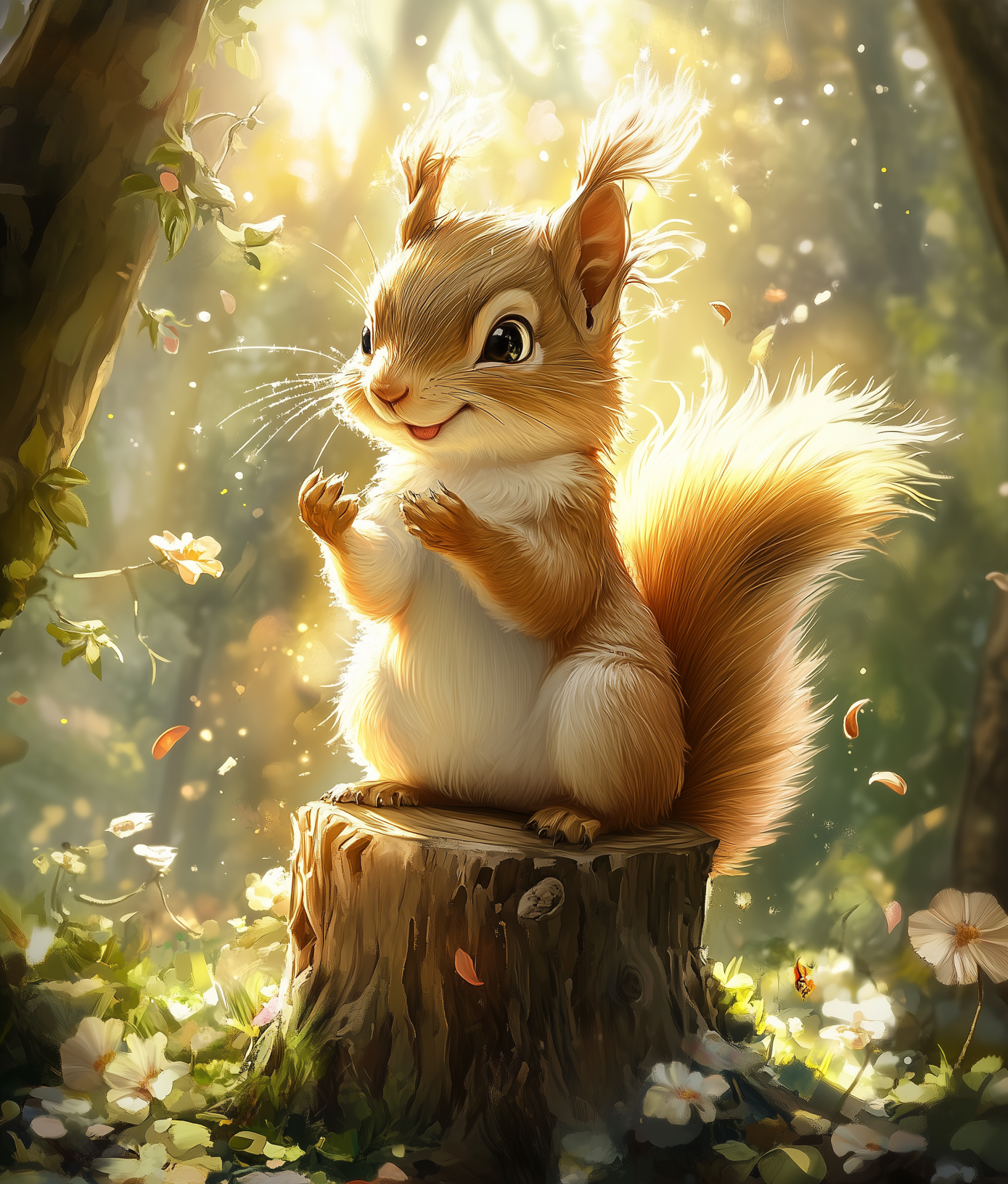 A cute squirrel with a fluffy tail is perched on a stump surrounded by vibrant greenery and colorful flowers. The scene is illuminated by bright sunlight filtering through the leaves, creating a warm and enchanting atmosphere.