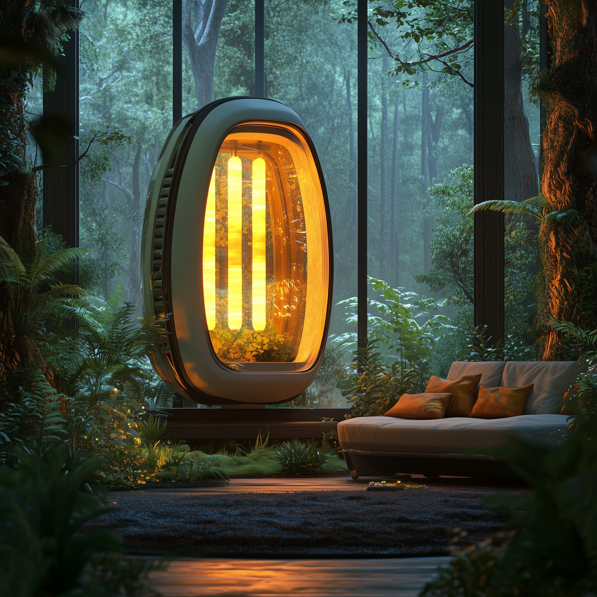 The image depicts a futuristic lamp positioned in a cozy living room setting designed for a furry creature species. The lamp features a unique design that complements the natural forest environment of the planet, invoking a sense of otherworldly charm.
