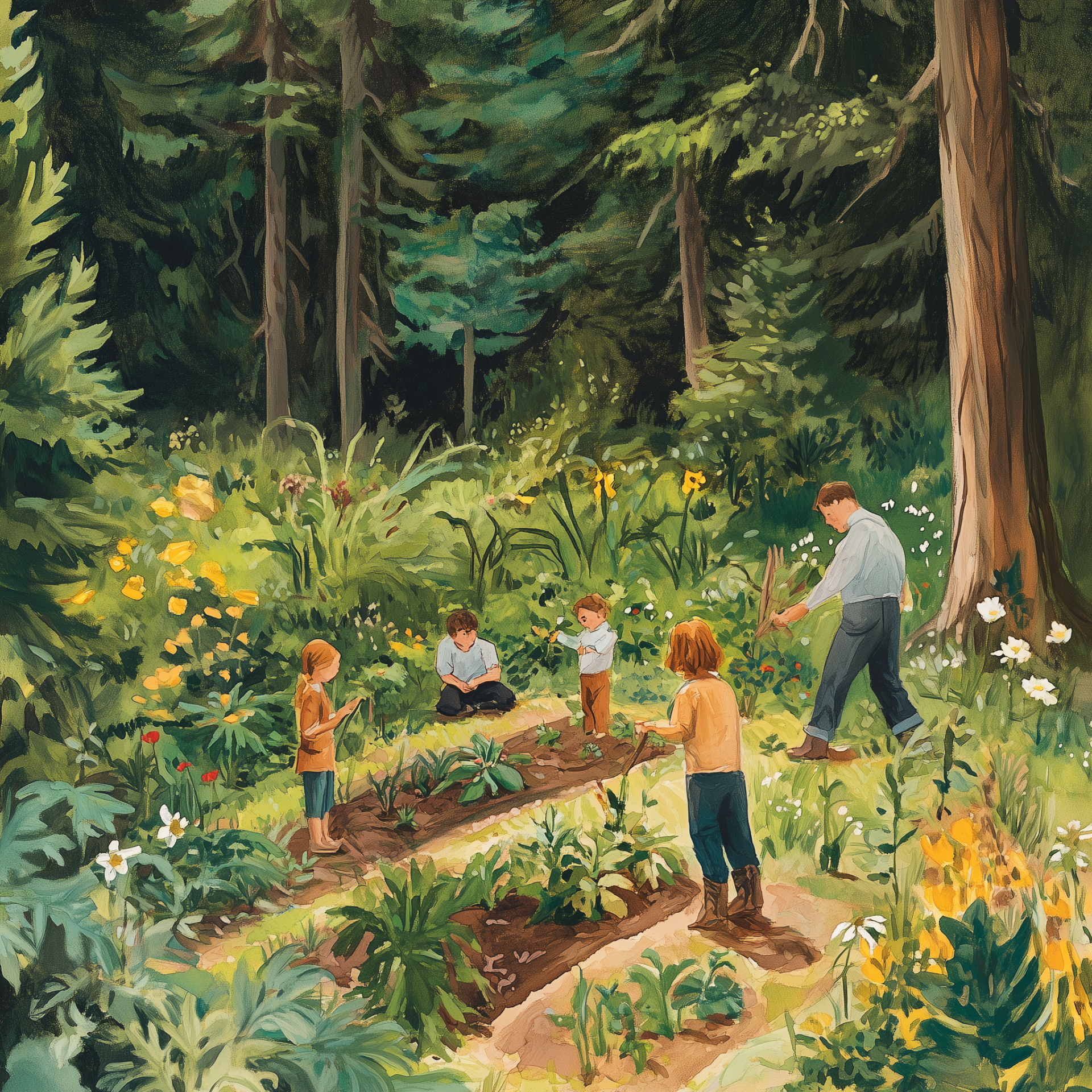 This image captures a vibrant gardening area nestled within a lush forest. Adults and children engage joyfully as they learn the art of growing crops together amidst nature.